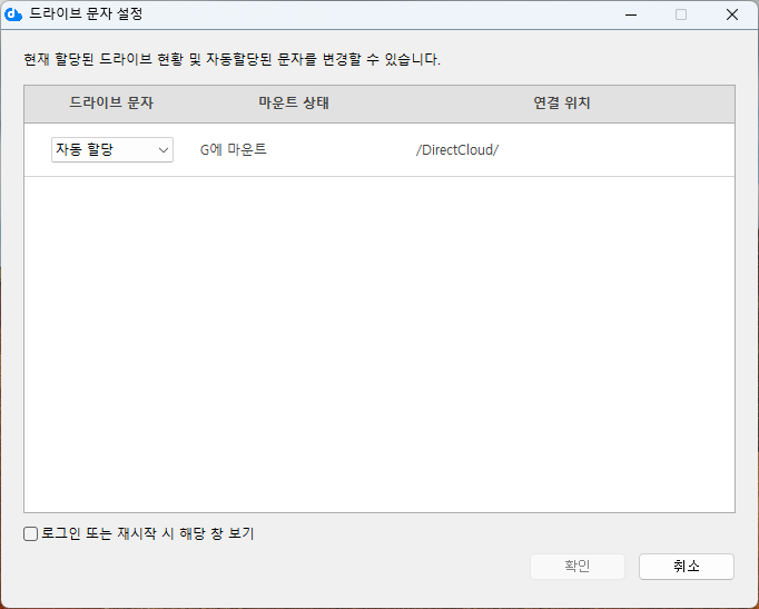 DirectCloud 드라이브에 로그인할 때 드라이브 문자 할당 설정 화면을 표시할지 여부를 전환할 수 있습니다.