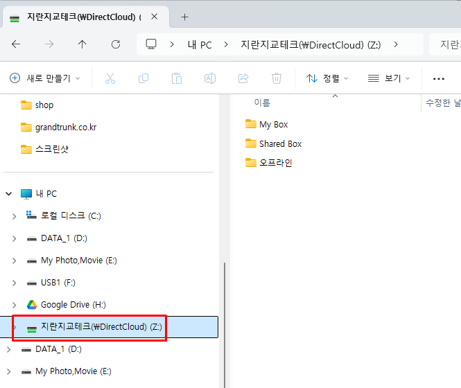 루트 폴더 /DirectCloud/에 할당된 드라이브 문자가 이미 Windows에서 사용 중인 경우, DirectCloud Drive 로그인 후 “드라이브 문자 ○가 이미 사용 중입니다.”라는 오류 메시지가 표시됩니다.