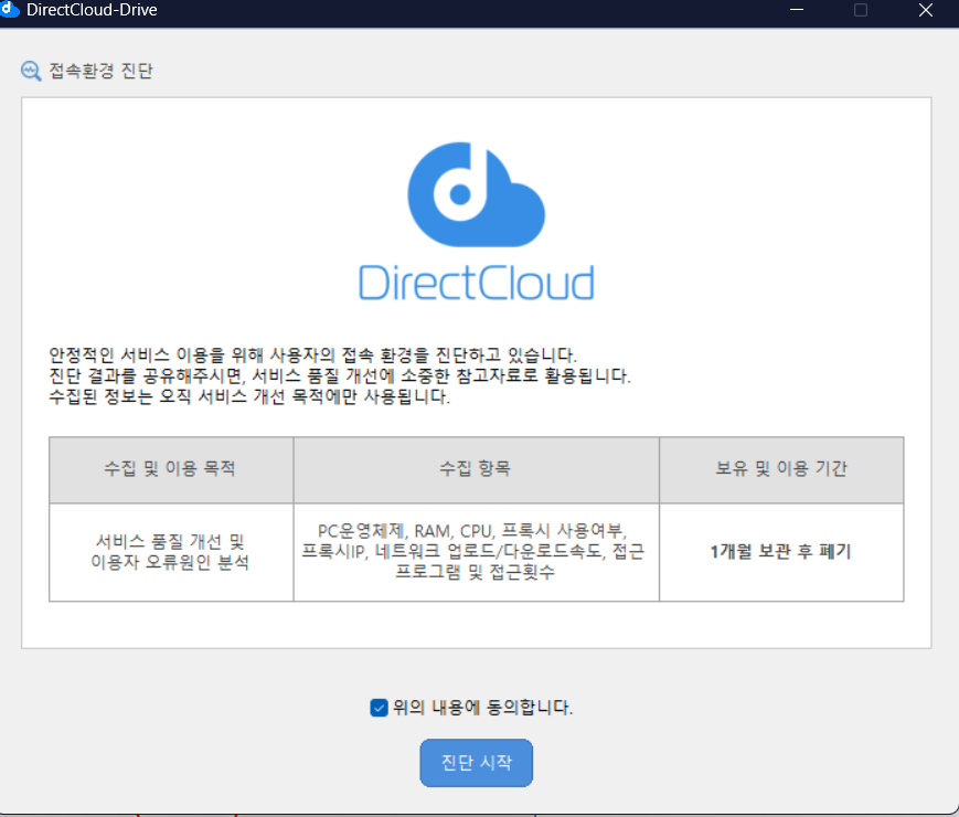 환경 진단을 시작하려면 수집된 PC 및 네트워크 정보를 DirectCloud로 전송해야 합니다. 수집되는 정보, 수집 목적, 보관 및 이용 기간에 동의하는 경우에는 ‘위의 내용에 동의합니다’에 체크한 후 ‘진단 시작’ 버튼을 클릭합니다.