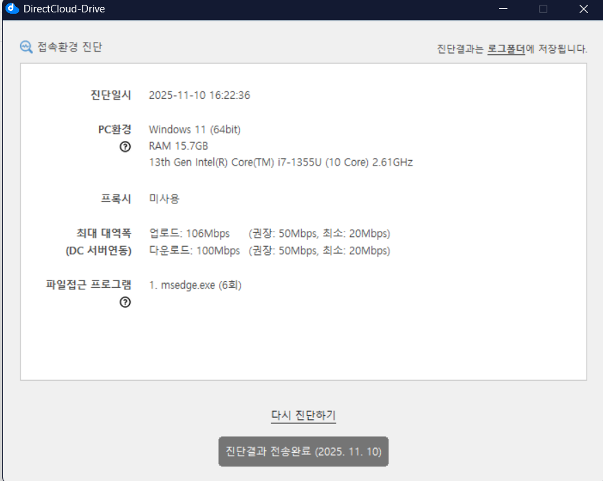 ‘DirectCloud 드라이브 접속환경 진단’의 진단 결과는 1개월간 보관됩니다. 최근 7일 이내에 ‘접속환경 진단’을 실행한 적이 있는 경우, ‘접속환경 진단’ 화면에 그 진단 결과가 표시됩니다.