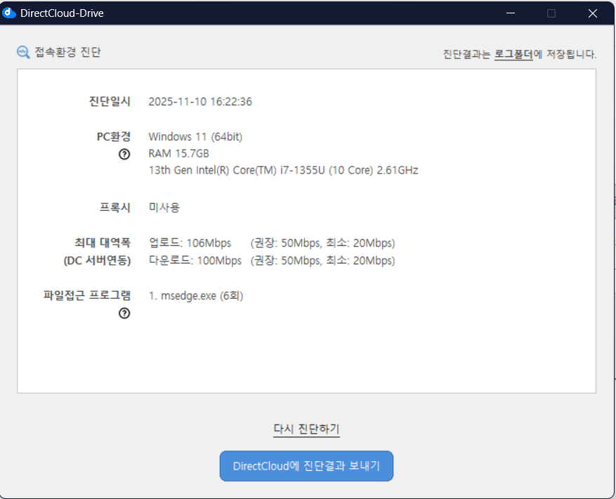 DirectCloud 드라이브 환경 진단 결과