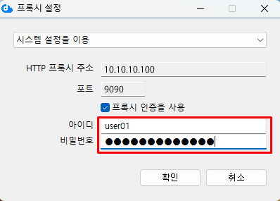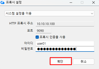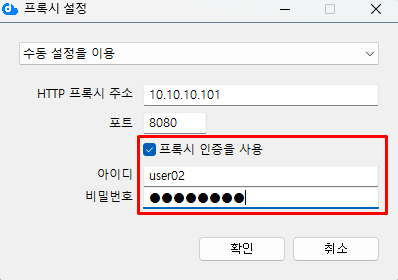 프록시 서버 사용에 인증이 필요한 경우 '프록시 인증을 사용'을 선택하고 사용자 ID와 암호를 입력합니다.