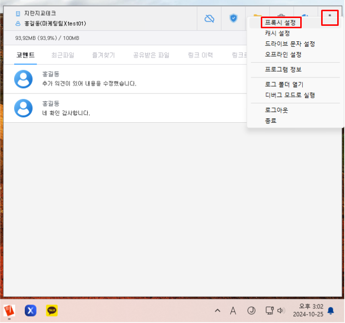 로그아웃 상태에서도 작업 메뉴의 DirectCloud 아이콘을 클릭하고 프록시 설정을 선택하면 프록시 설정 화면을 표시할 수 있습니다.