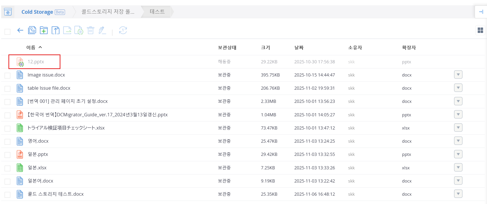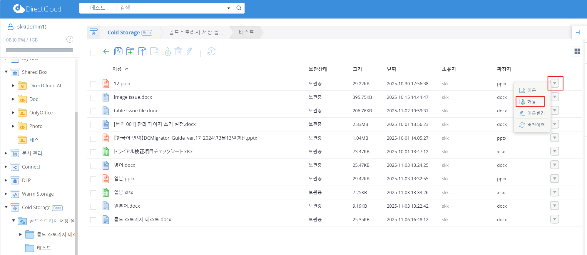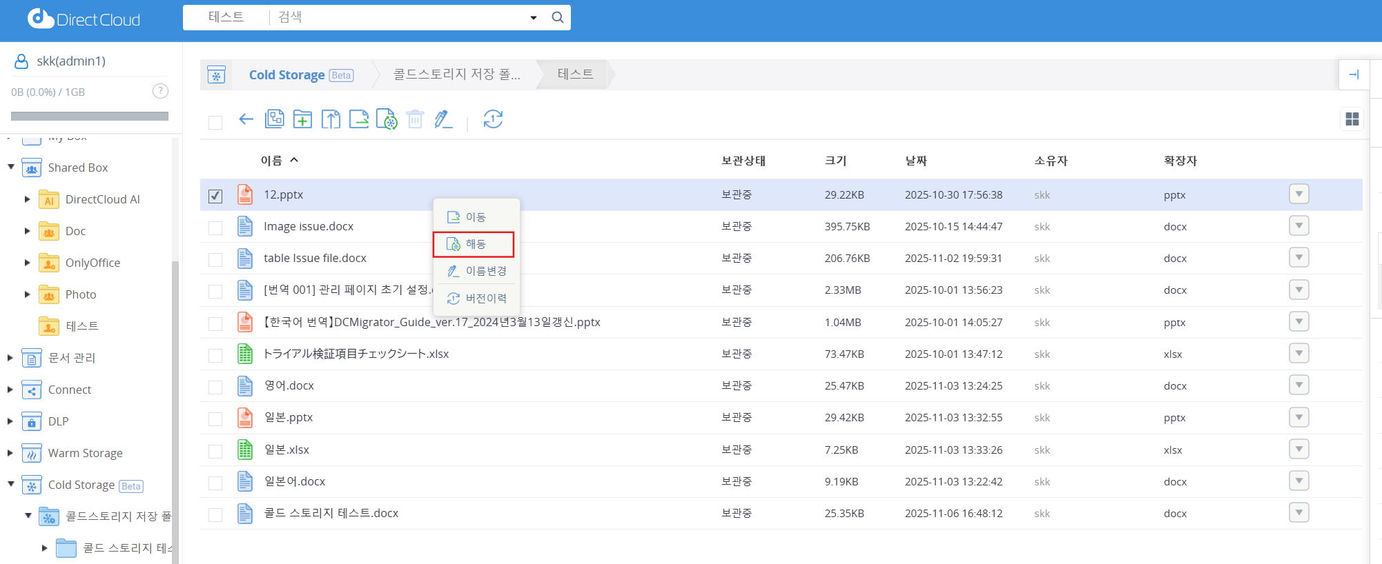 Cold Storage에서 Shared Box로 파일을 복원한 경우: ‘해동’