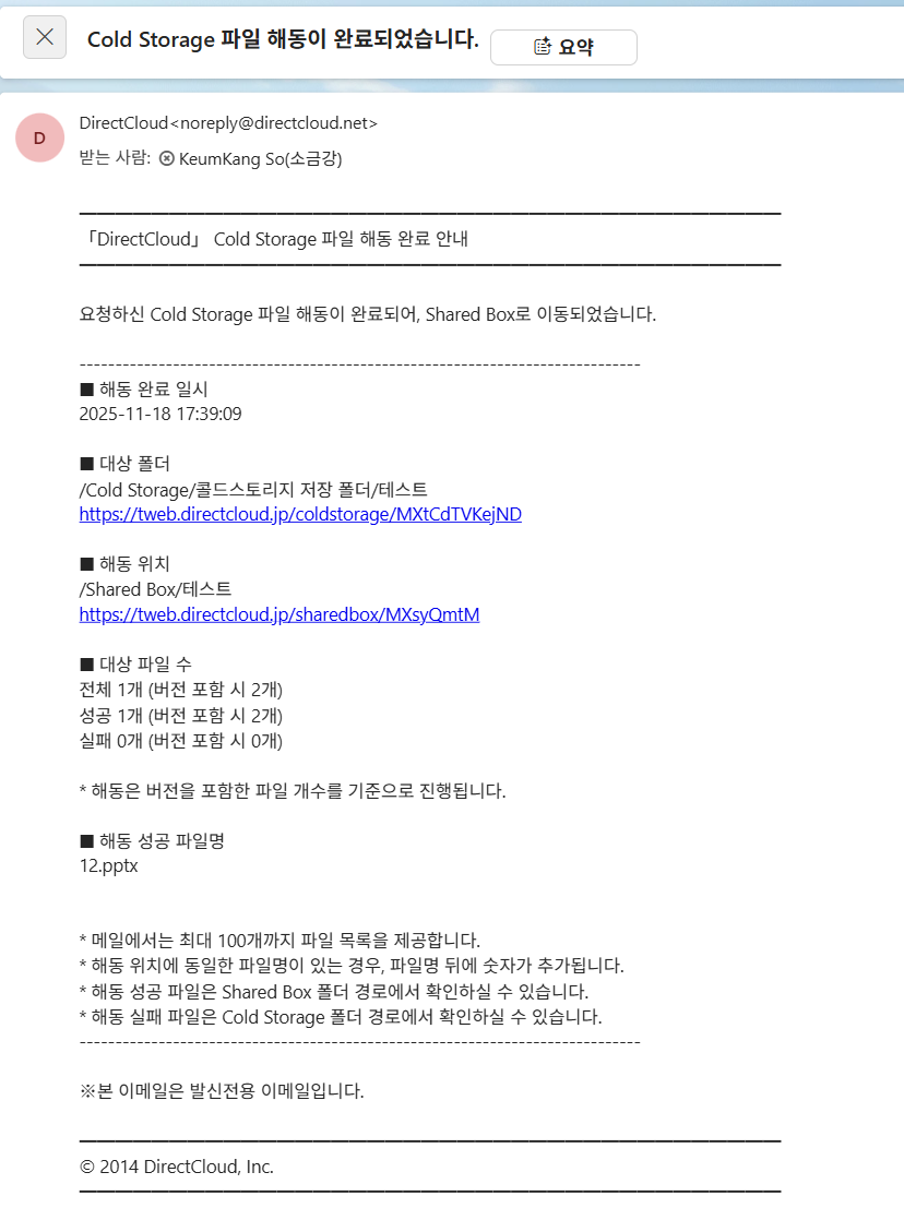 복원 요청한 파일의 복원이 완료되면, 복원 원본 폴더에 접근 권한이 있는 모든 사용자에게 ‘Cold Storage 파일 해동이 완료되었습니다.’라는 제목의 메일이 발송됩니다.