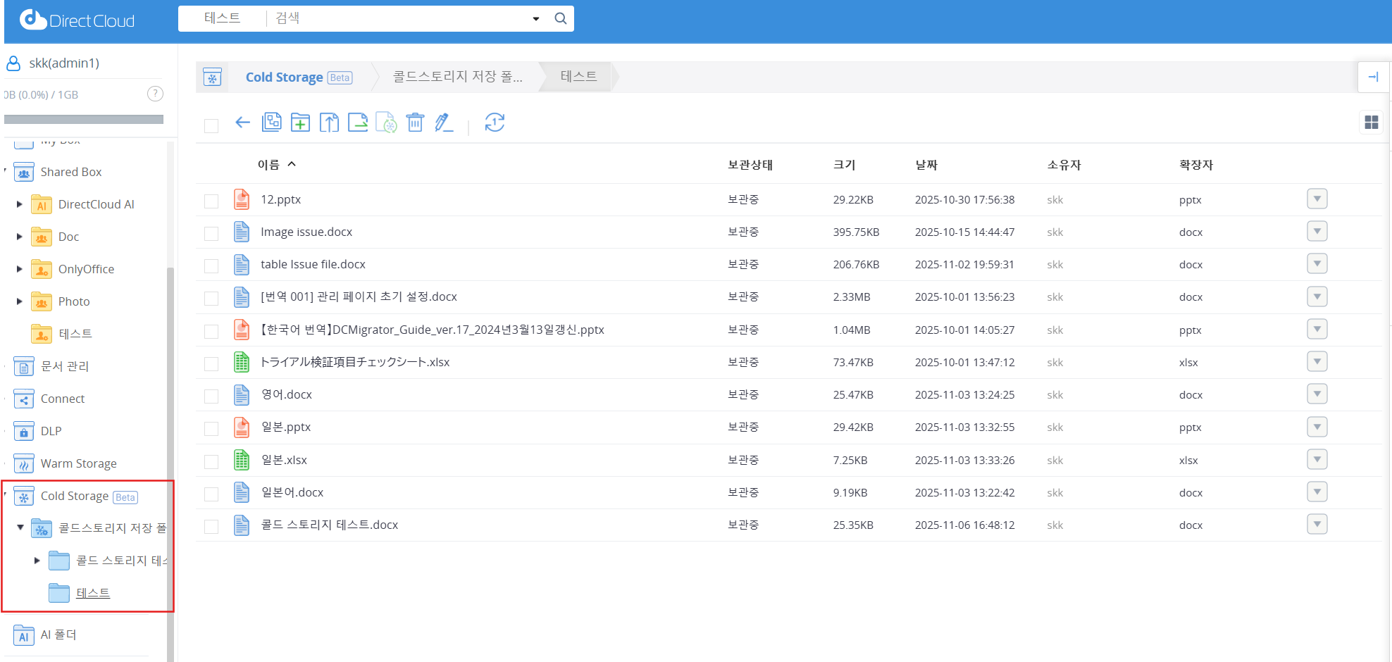 Cold Storage를 계약한 경우에는 사용자 페이지에 ‘Cold Storage’ 메뉴가 표시됩니다.