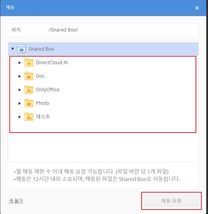복원 대상 Shared Box 폴더를 선택하고 ‘해동 요청’ 버튼을 클릭합니다. NOTE: ‘새 폴더’를 클릭하면 새 폴더를 생성할 수 있습니다.