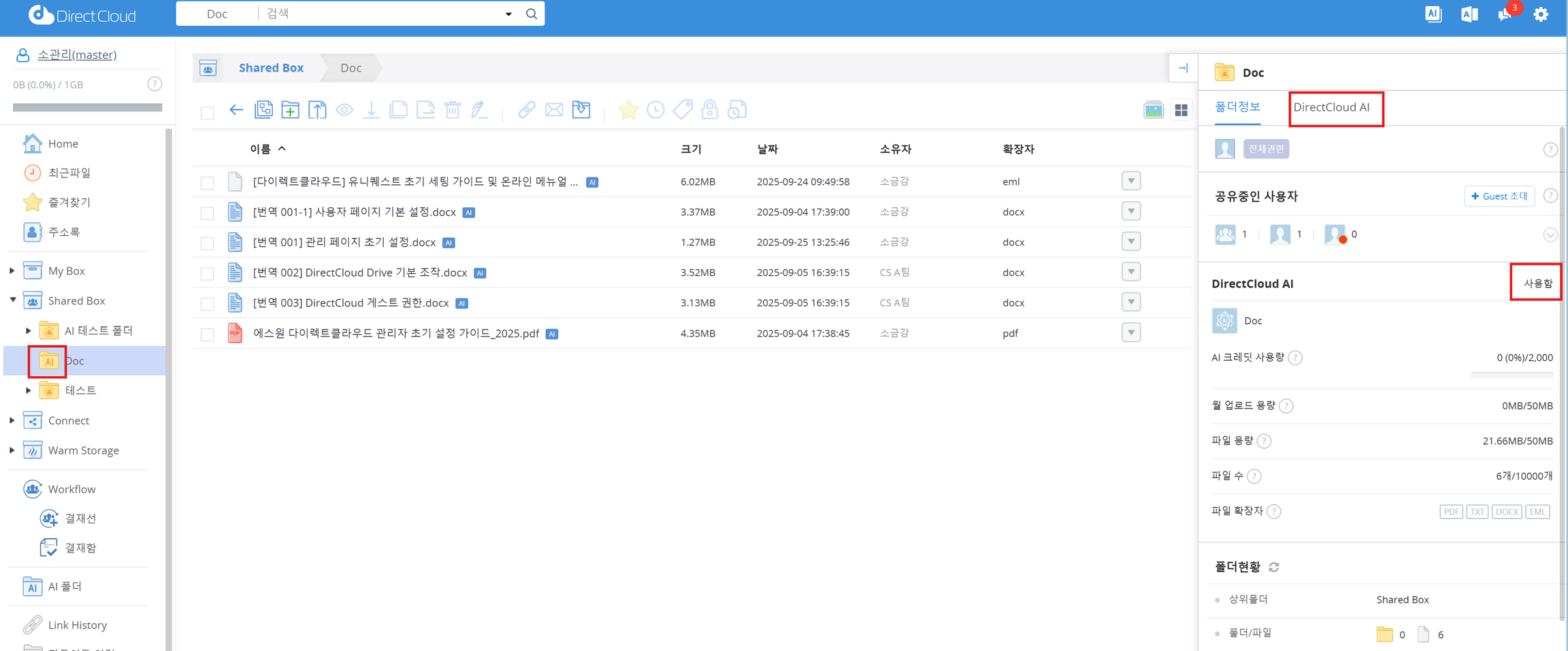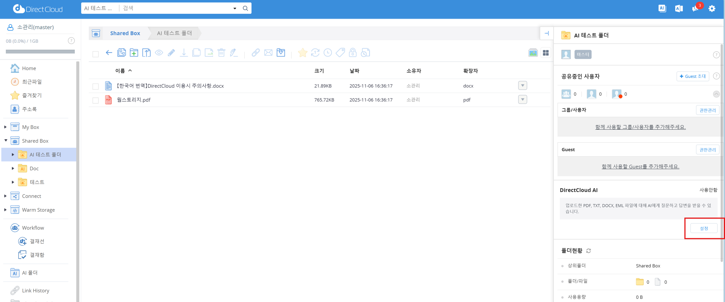 Shared Box 메뉴를 클릭하고, DirectCloud AI를 설정하려는 폴더를 클릭합니다.