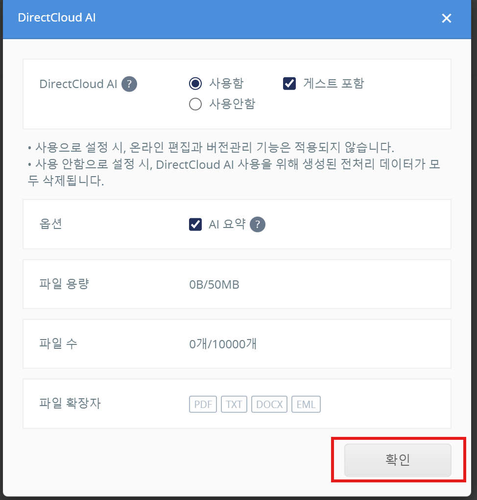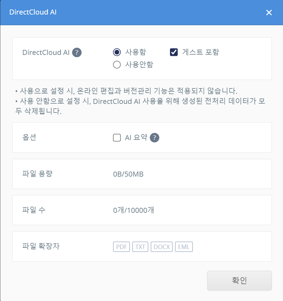 ‘DirectCloud AI’ 설정은 기본적으로 ‘사용하지 않음’으로 설정되어 있습니다.