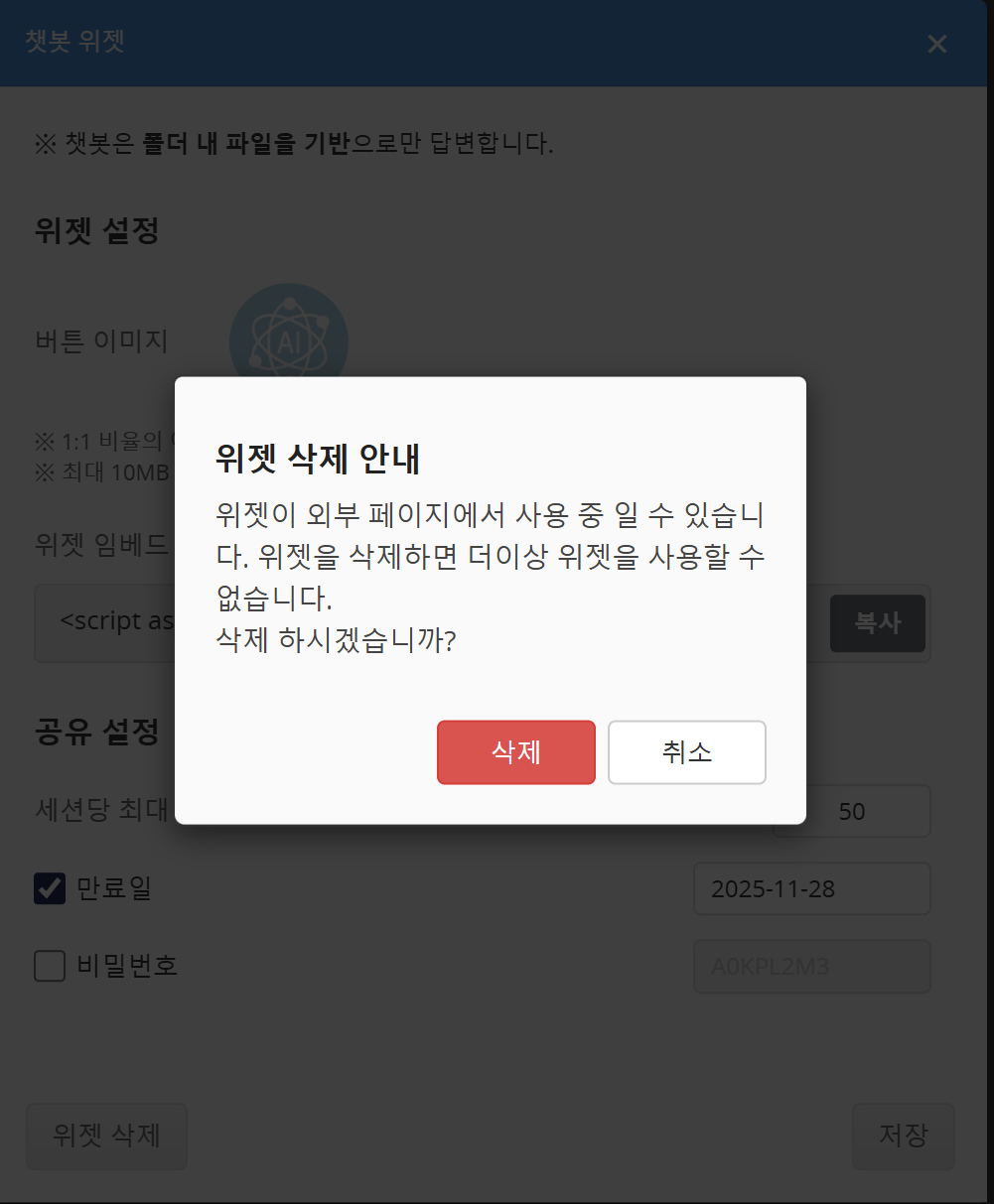 Web페이지에 챗봇 위젯이 설치되어 있는 경우, 삭제 확인 화면이 표시됩니다. '삭제' 버튼을 클릭합니다.