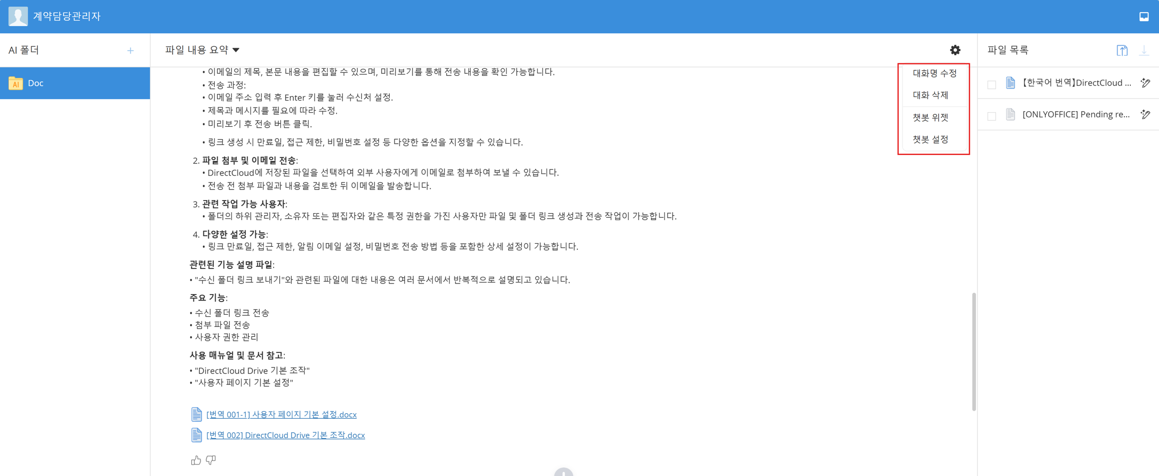 DirectCloud의 폴더에서 채팅룸을 이용하는 경우와 챗봇 위젯을 이용하는 경우의 사양 차이 또한 DirectCloud AI 사양 및 참고 사항을 참조해주시기 바랍니다.