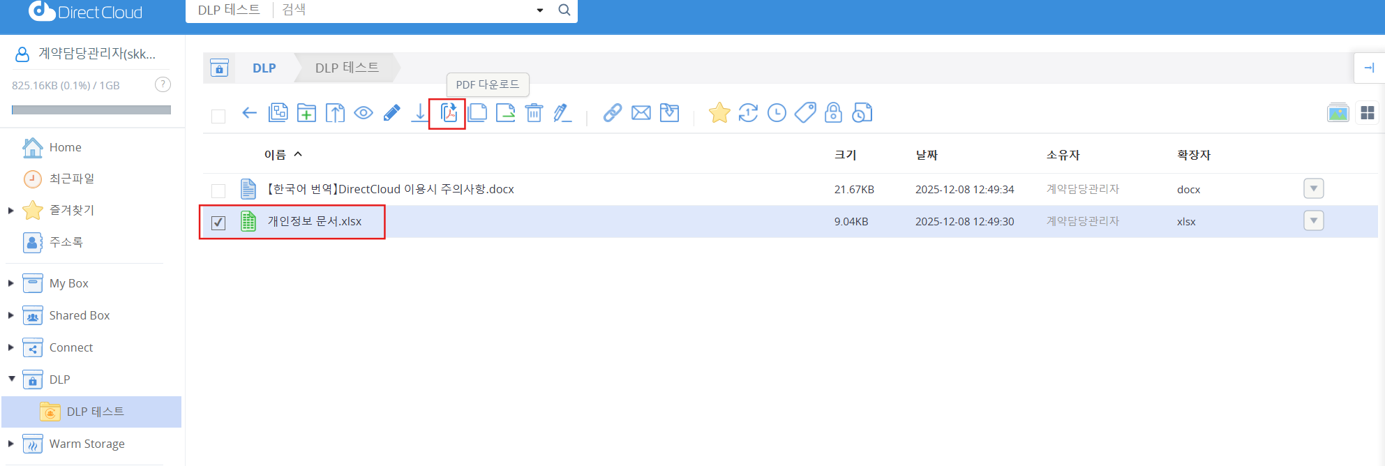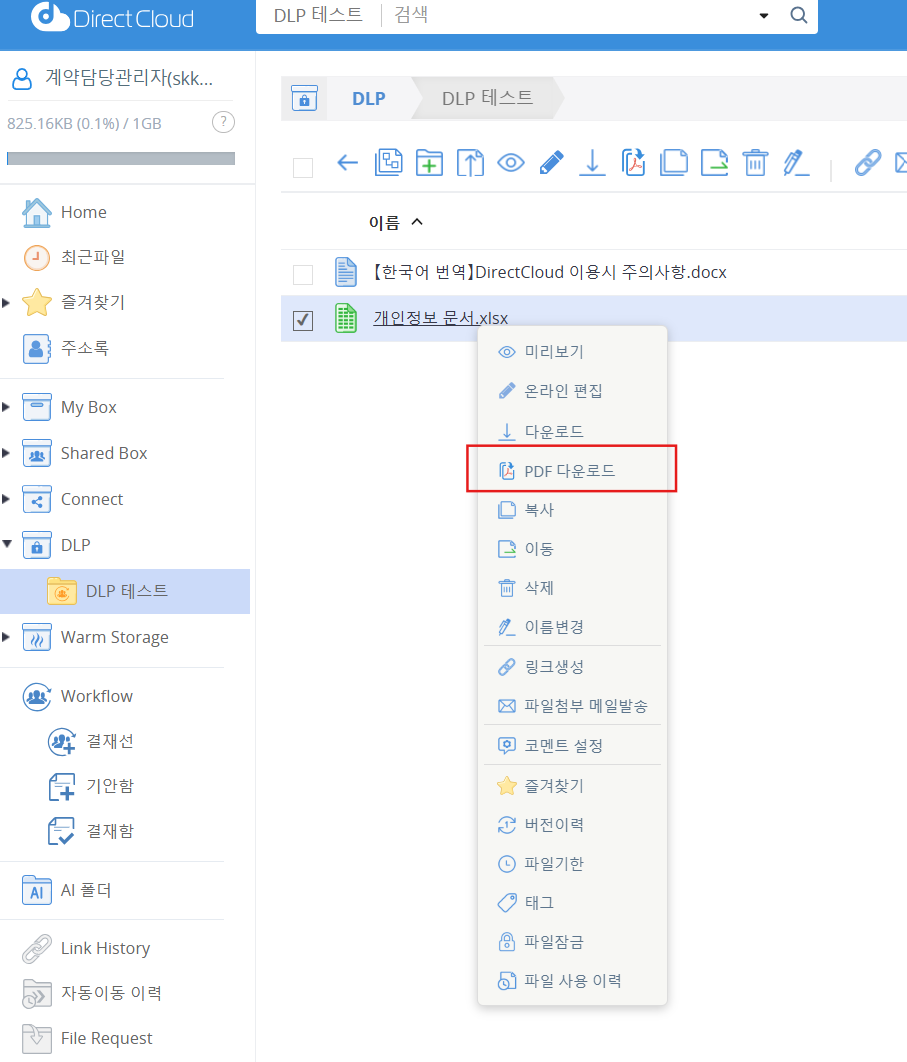 이 매뉴얼에서는 Web 브라우저 및 DirectCloud 드라이브에서 DLP 폴더에 저장된 파일을 PDF로 변환하여 다운로드하는 방법에 대해 설명합니다.