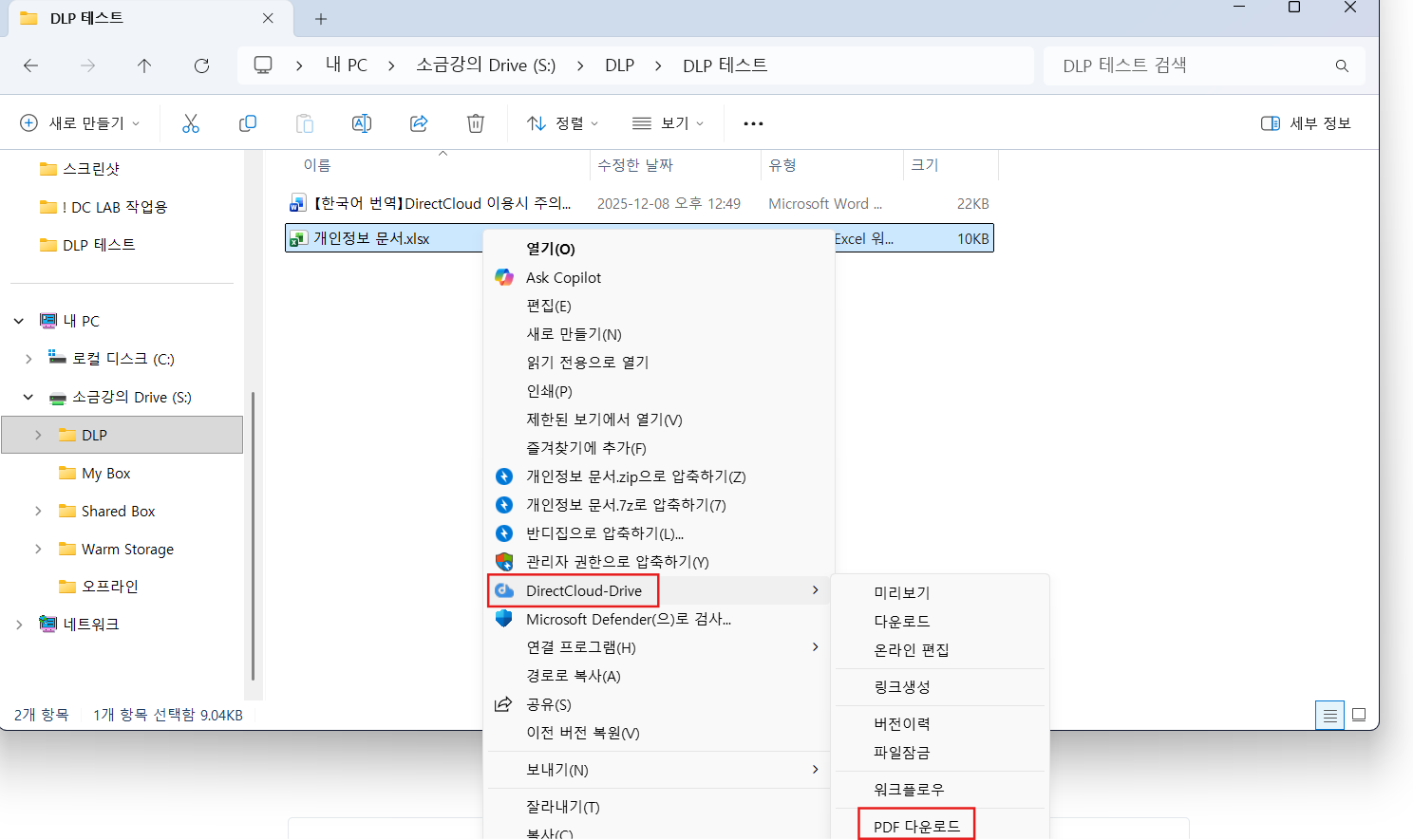 PDF로 다운로드하려는 파일을 마우스 오른쪽 버튼으로 클릭한 뒤, 표시된 메뉴에서 'DirectCloud-Drive' > 'PDF 다운로드'를 클릭합니다.