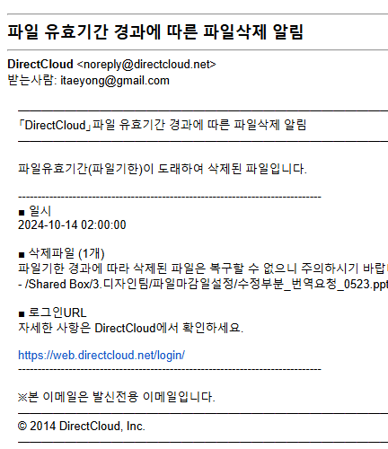 '파일 기한' 화면에서 '이메일 수신안함'을 체크하지 않고 설정한 경우, '파일 유효기간 경과에 따른 파일삭제 알림.'이라는 제목의 알림 메일이 도착합니다.