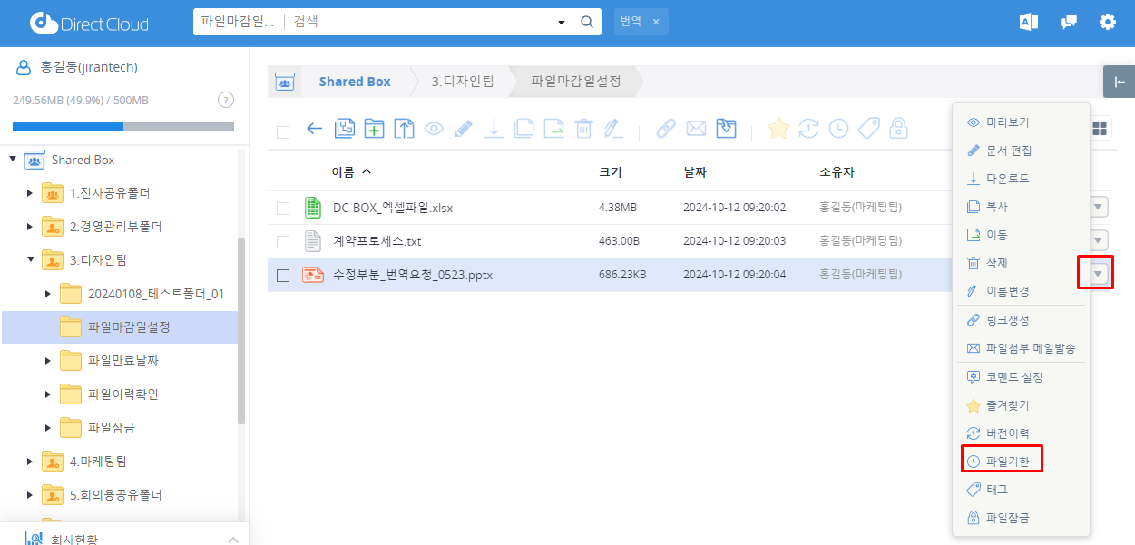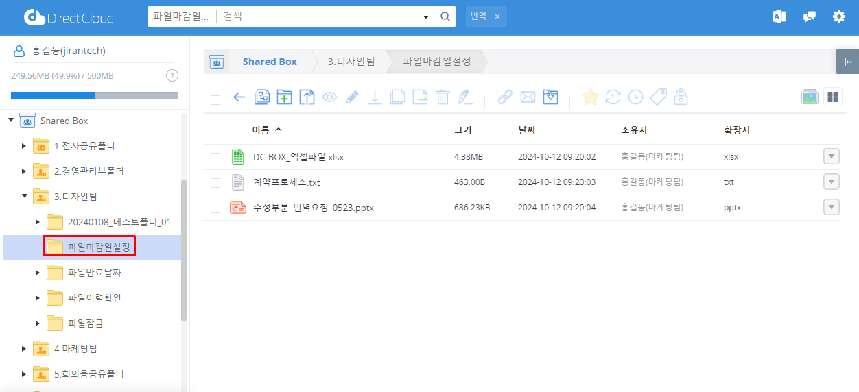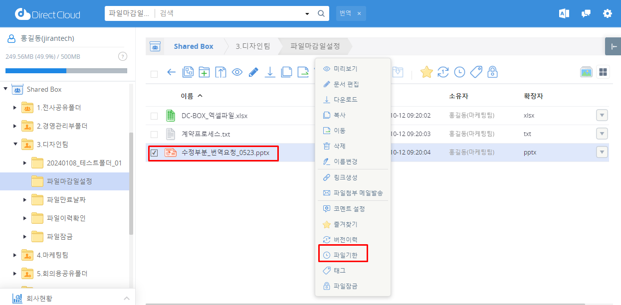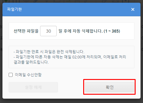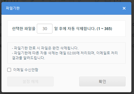 한 번 파일 기간을 설정하면 해당 파일이 자동 삭제될 때까지 남은 일수를 변경할 수 없습니다.