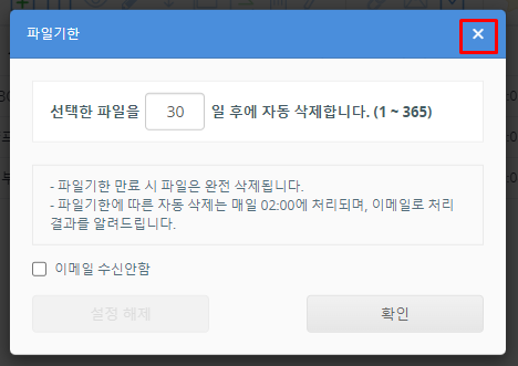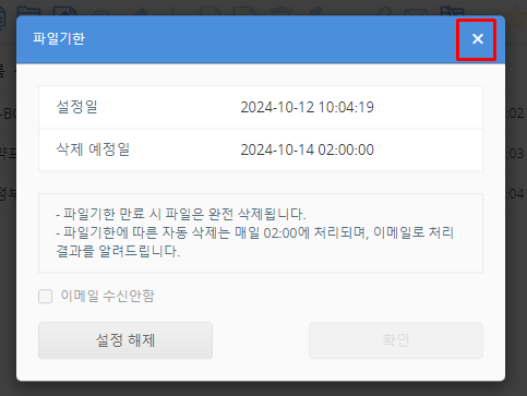 설정된 파일 기한을 확인하고 ✕ 버튼을 클릭합니다.