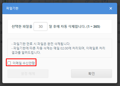 파일이 삭제될 때 알림 메일을 받지 않으려면 '이메일 수신 안함'에 체크합니다.