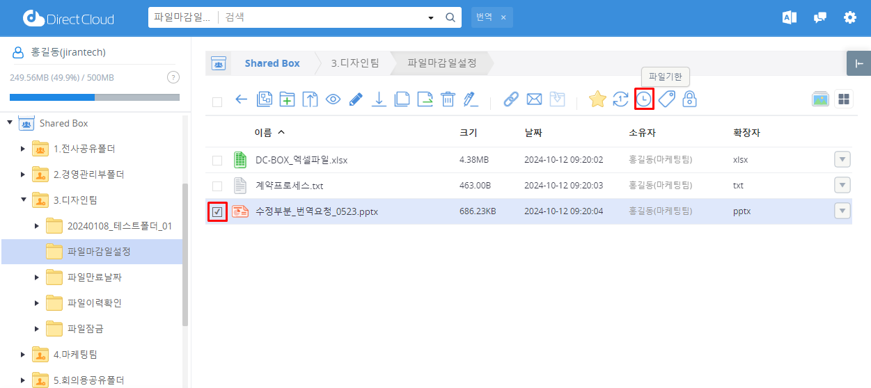 ❶ 파일 기한일을 설정하고자 하는 파일을 체크하고 상단의 '파일 기한' 버튼을 클릭합니다.