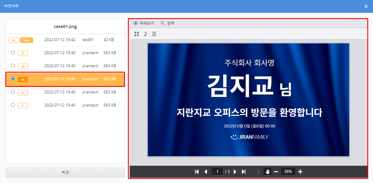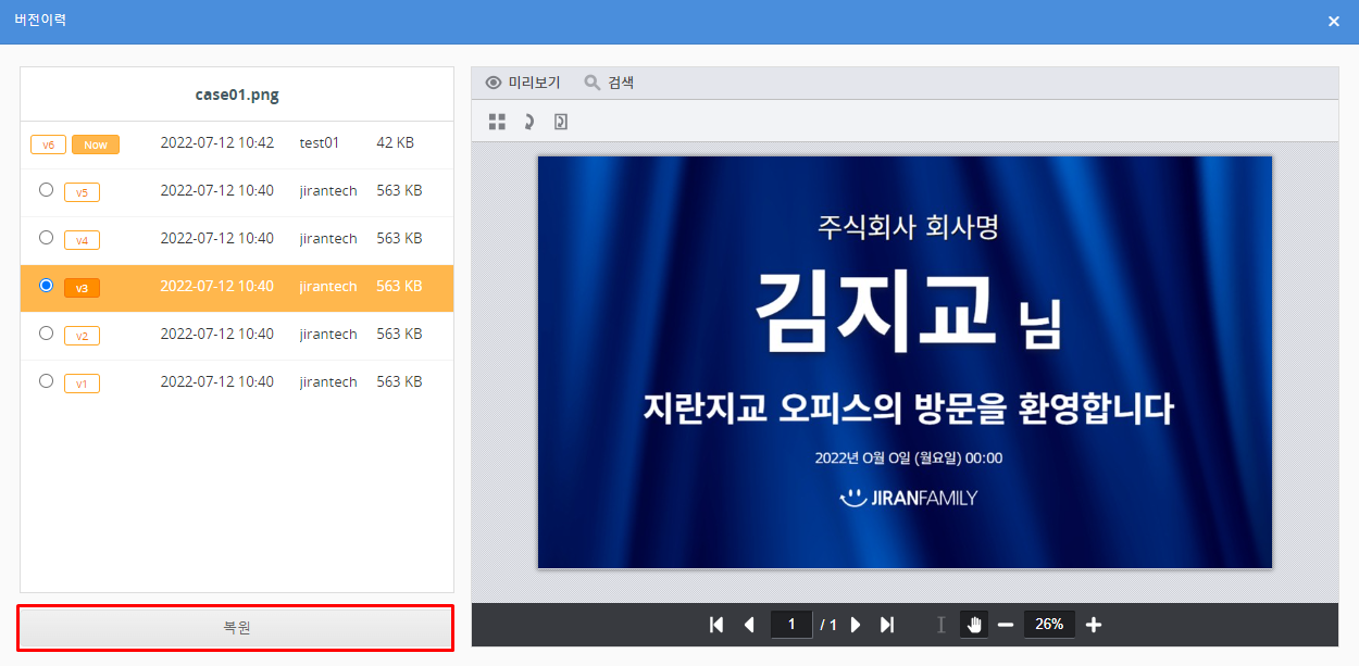 파일을 이전 버전으로 되돌리려면 <마스터>, <전체권한>의 접근 권한이 부여되어야 합니다.