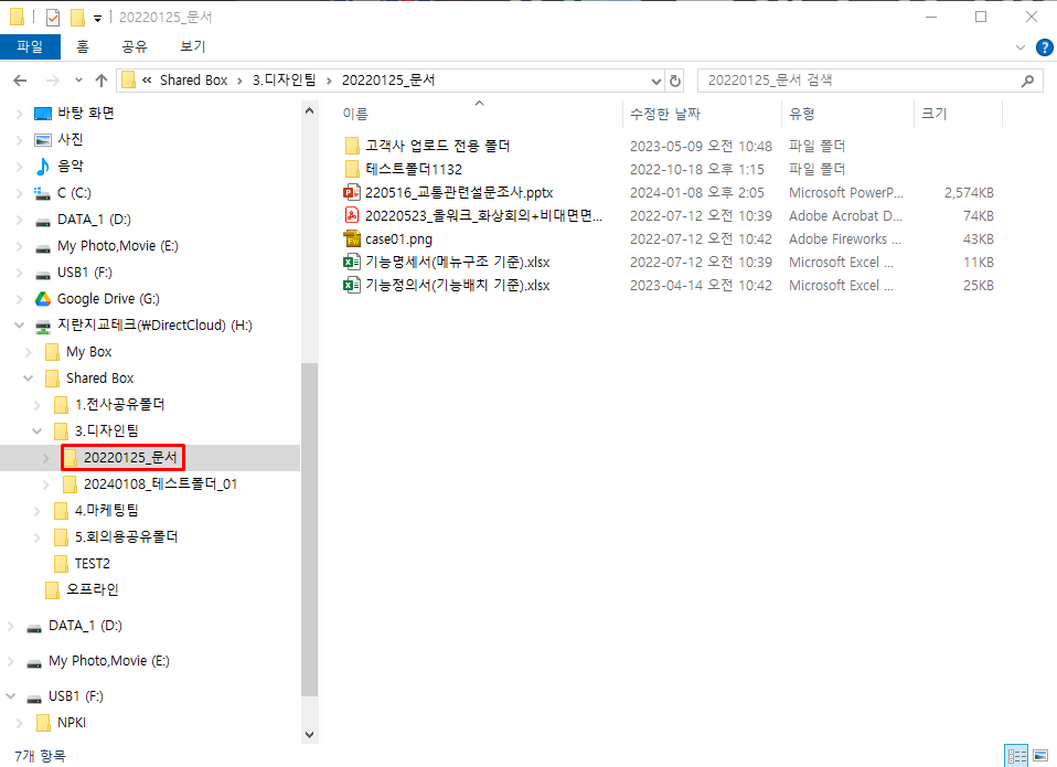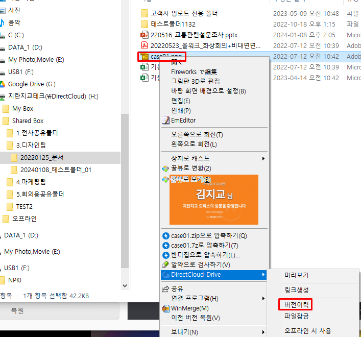 버전을 되돌리려는 파일을 마우스 오른쪽 버튼으로 클릭하고 표시된 메뉴에서 'DirectCloud-Drive' > '버전이력'을 클릭합니다.