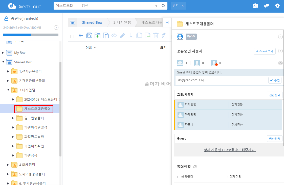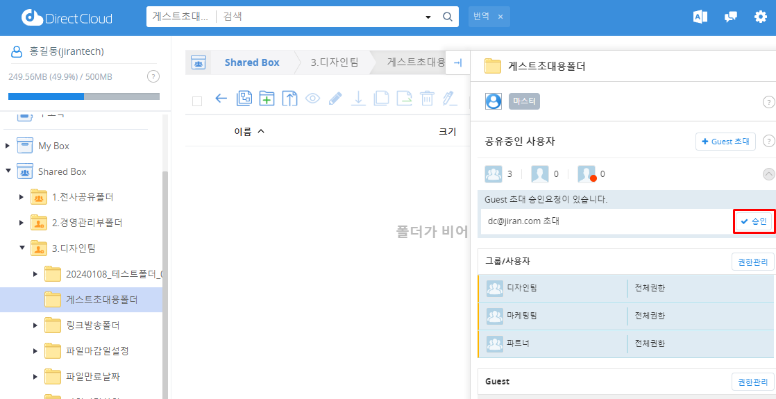 접근 권한이 <마스터>로 부여된 사용자가 사용자 페이지에 로그인한 후, Guest 초대를 승인하려는 폴더에 접근합니다.