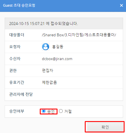 Guest 초대에 대한 자세한 정보를 확인한 후 승인을 선택하고 확인 버튼을 클릭합니다.