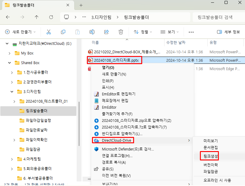 링크를 생성하려는 파일을 마우스 오른쪽 버튼으로 클릭한 후, 'DirectCloud-Drive' > '링크 생성'을 클릭합니다.