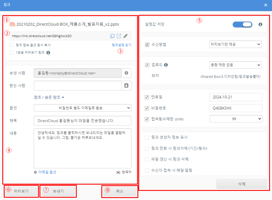 체크를 하면, ❶의 "링크 복사" 아이콘으로 링크를 복사할 때, "파일 이름"과 "파일 용량" 외에 "유효 기간", "비밀번호", "접근 횟수 제한" 정보를 함께 포함할 수 있습니다.
