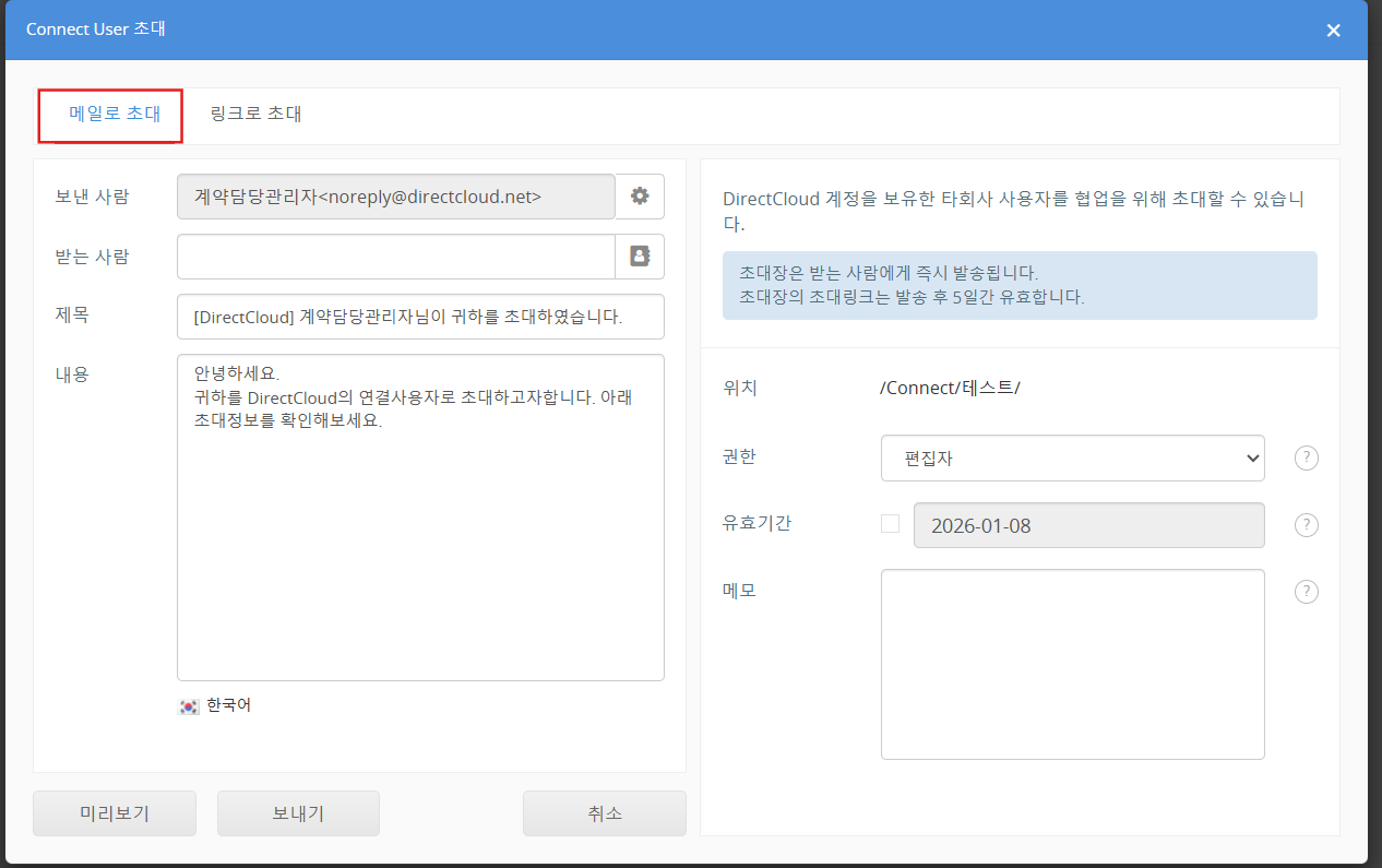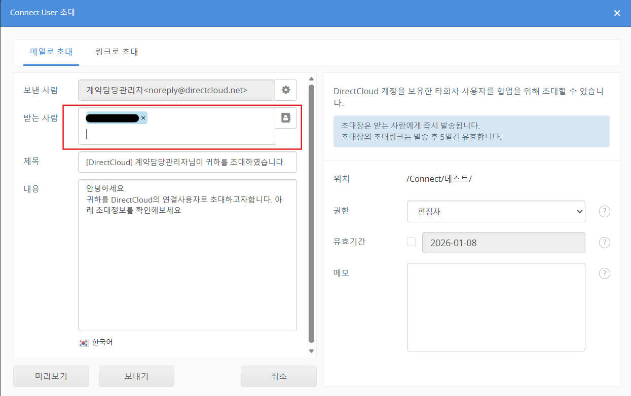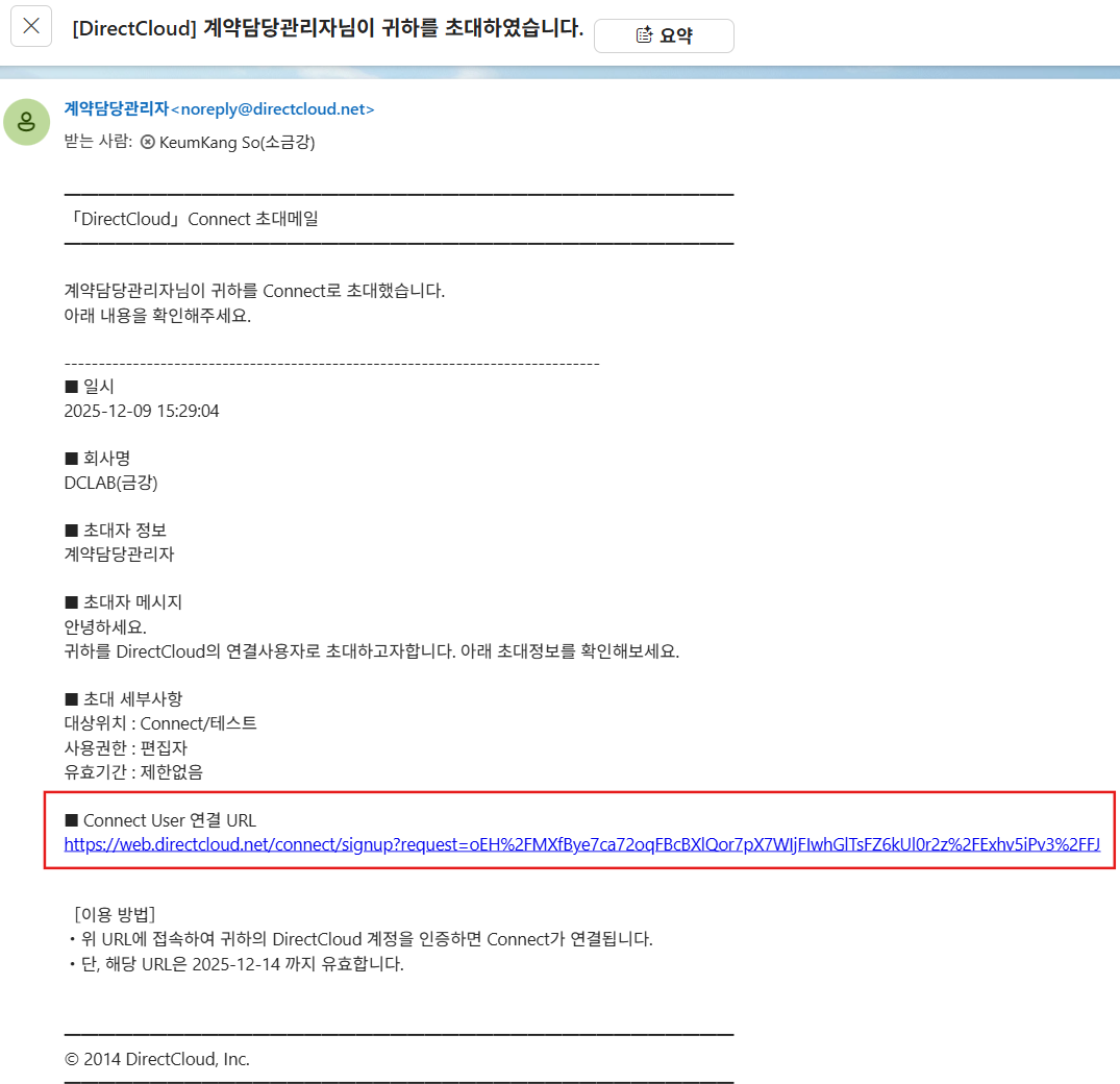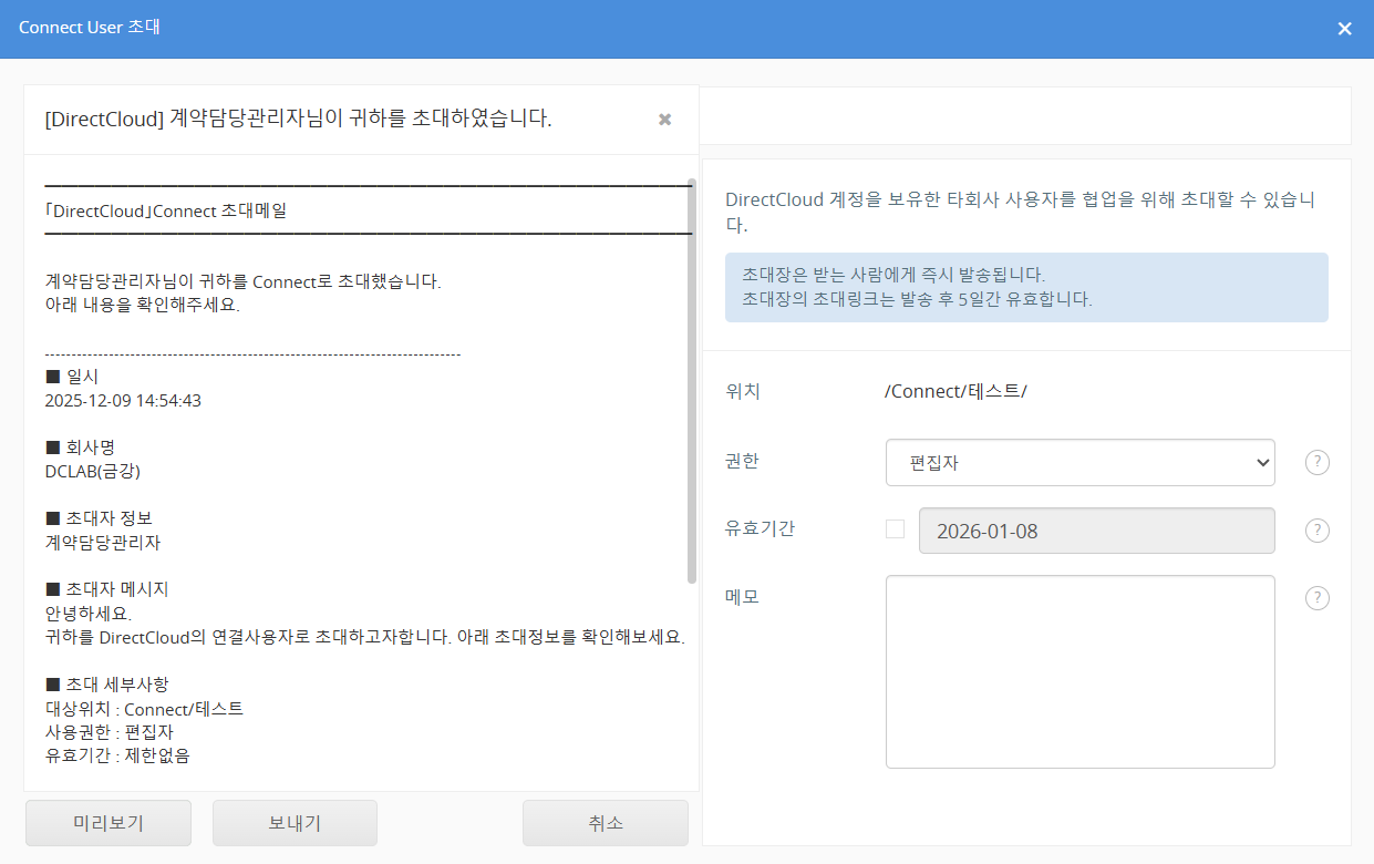 Connect User 초대는 Guest 초대와 달리, 초대 대상 사용자가 DirectCloud의 회사 ID를 보유하고 있어야 합니다.