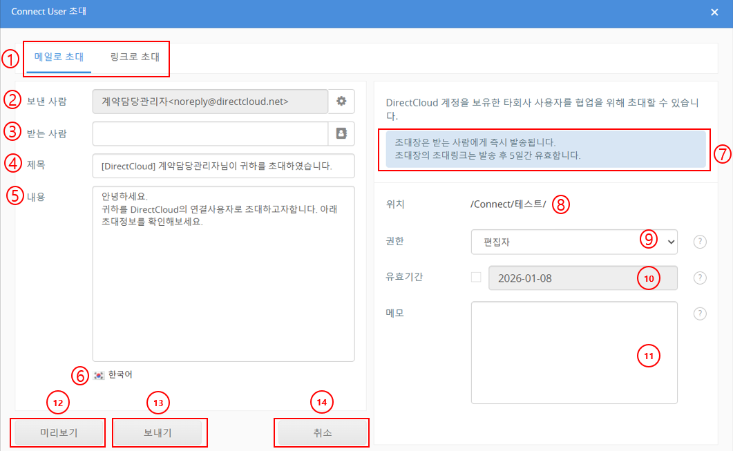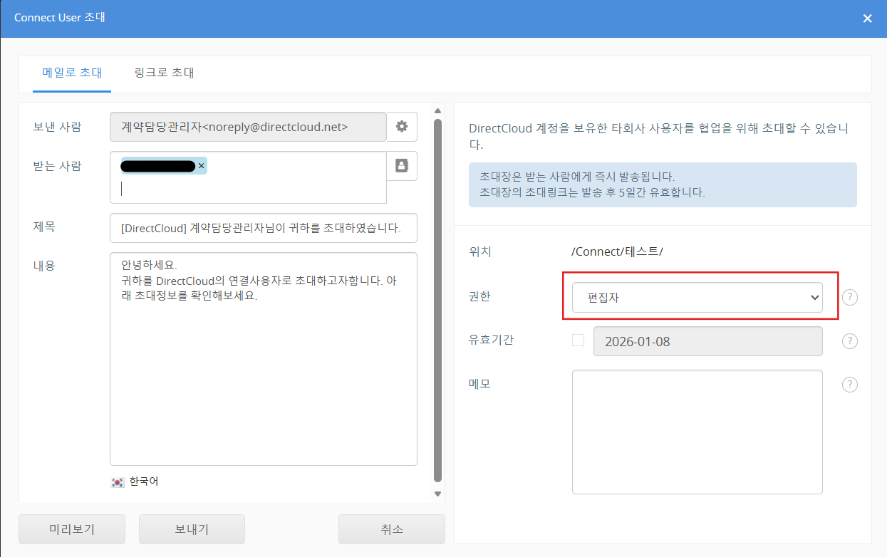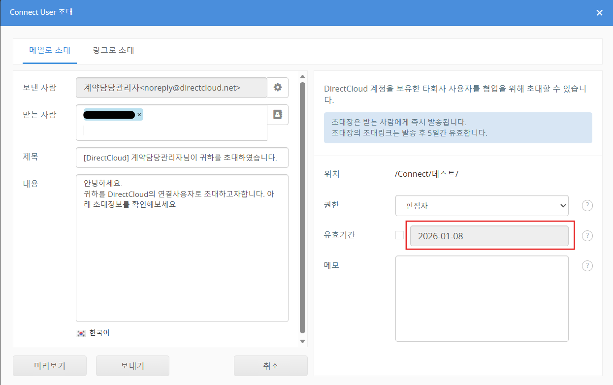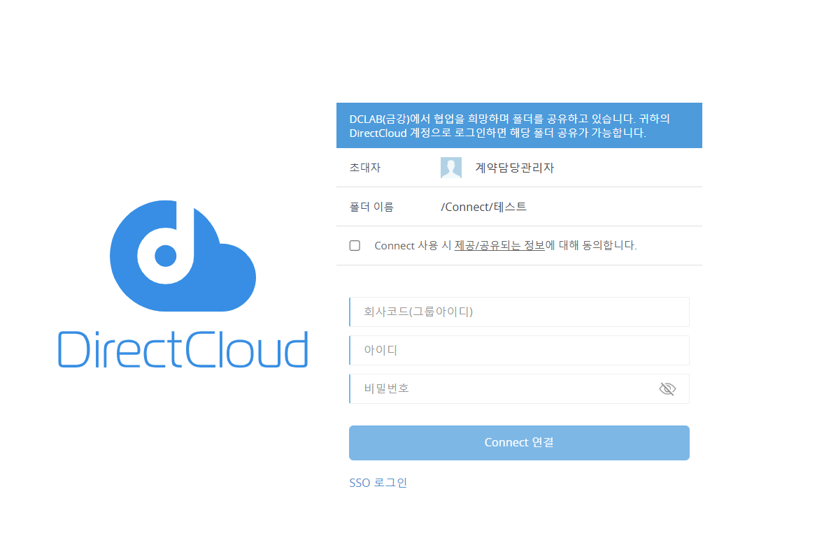 Connect User 초대는 Guest 초대와 달리, 초대 대상 사용자가 DirectCloud의 회사 ID를 보유하고 있어야 합니다.