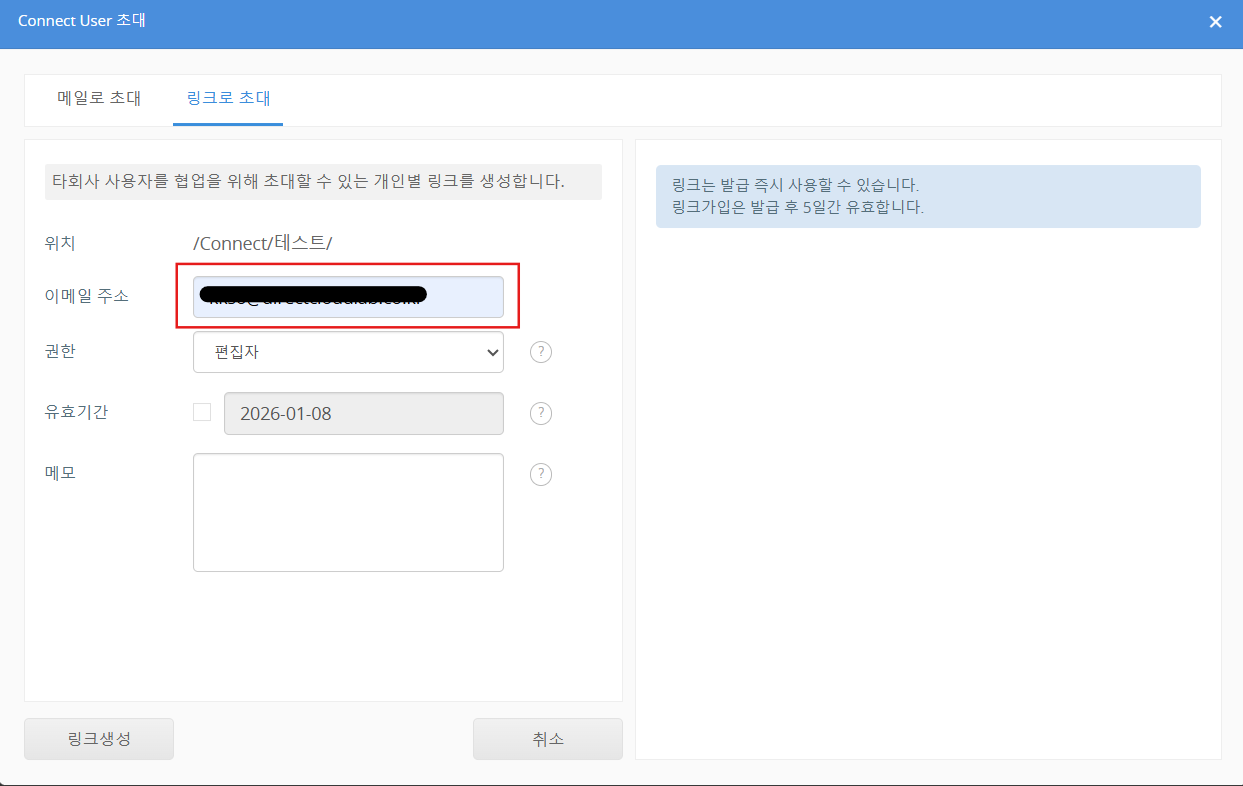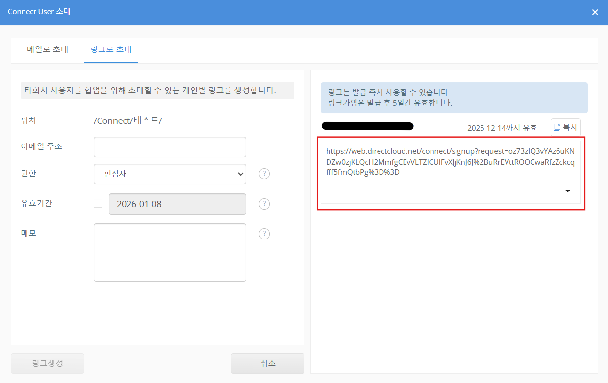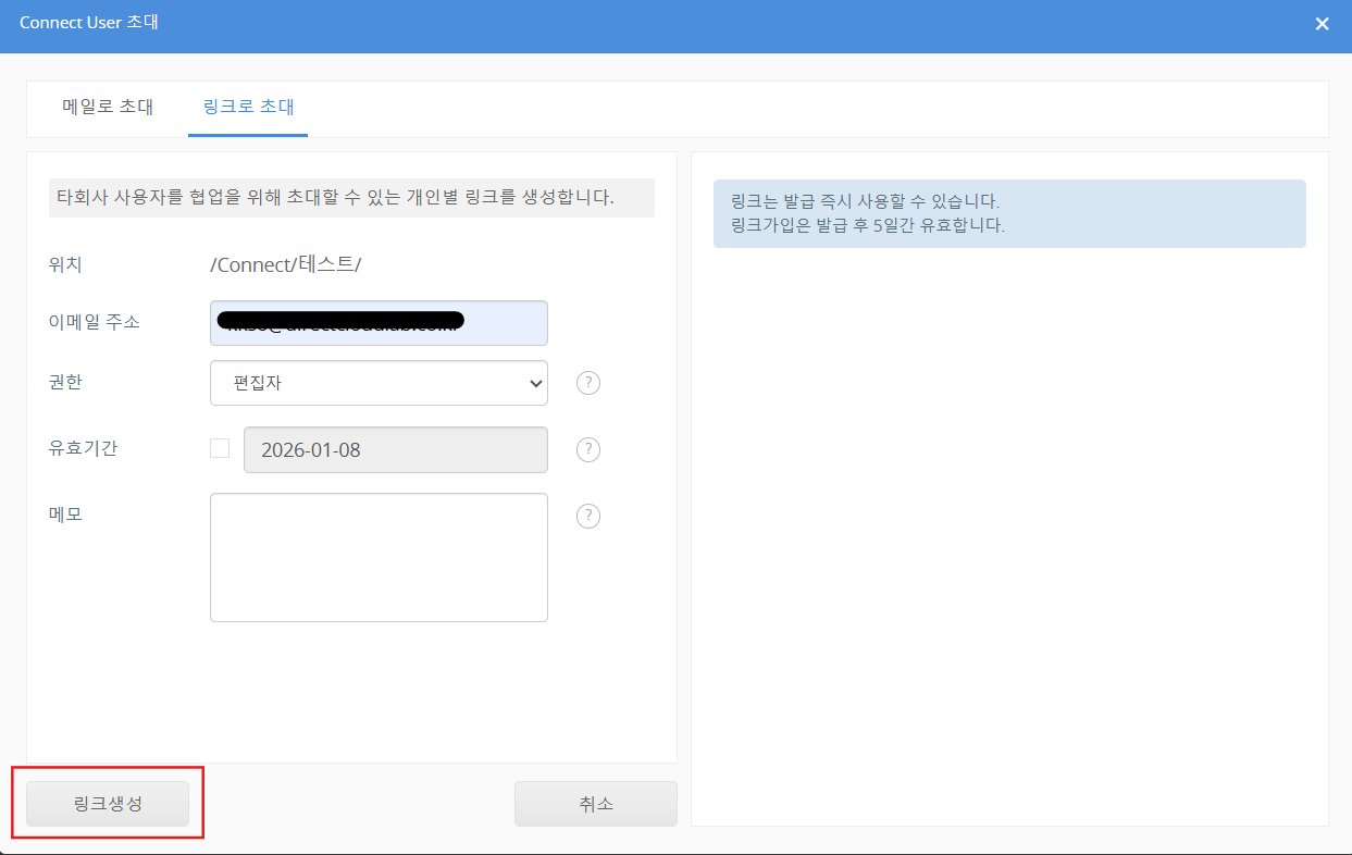 링크생성 버튼을 클릭합니다. 화면 오른쪽 영역에 발급된 Connect User 초대용 URL이 표시됩니다.