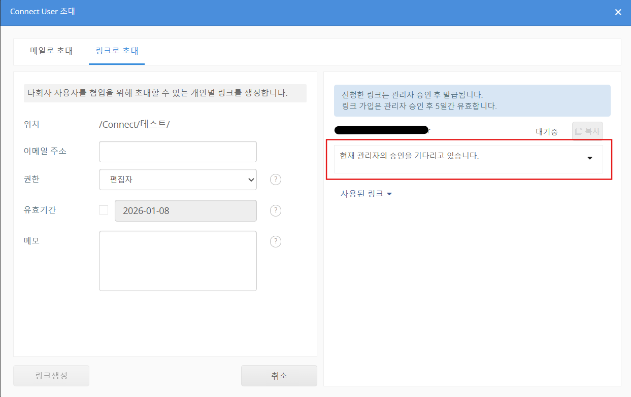 Connect User 초대에 관리자 승인이 필요한 경우, 이 위치에 Connect User 초대 메일은 관리자가 승인한 후 전송됩니다. 라고 표시됩니다. 관리자 설정에 대해서는 관리자 승인 후 Connect 초대 메일을 전송하도록 설정하는 방법을 참고해주시기 바랍니다.