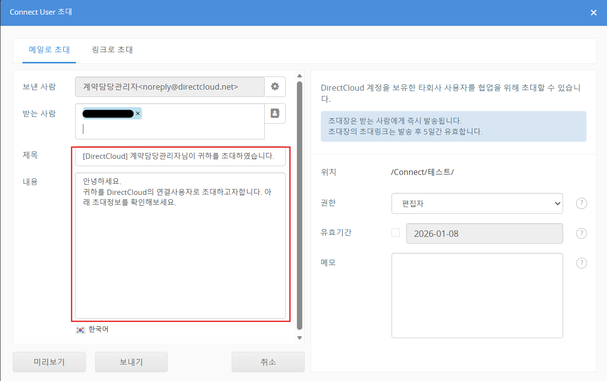 Connect User 초대 화면에서 메일을 전송할 때, 메일 본문에 추가될 문장을 입력합니다. 변경하지 않을 경우, "안녕하세요. 귀하를 DirectCloud의 연결사용자로 초대하고자합니다. 아래 초대정보를 확인해보세요." 라는 내용으로 메일이 전송됩니다.
