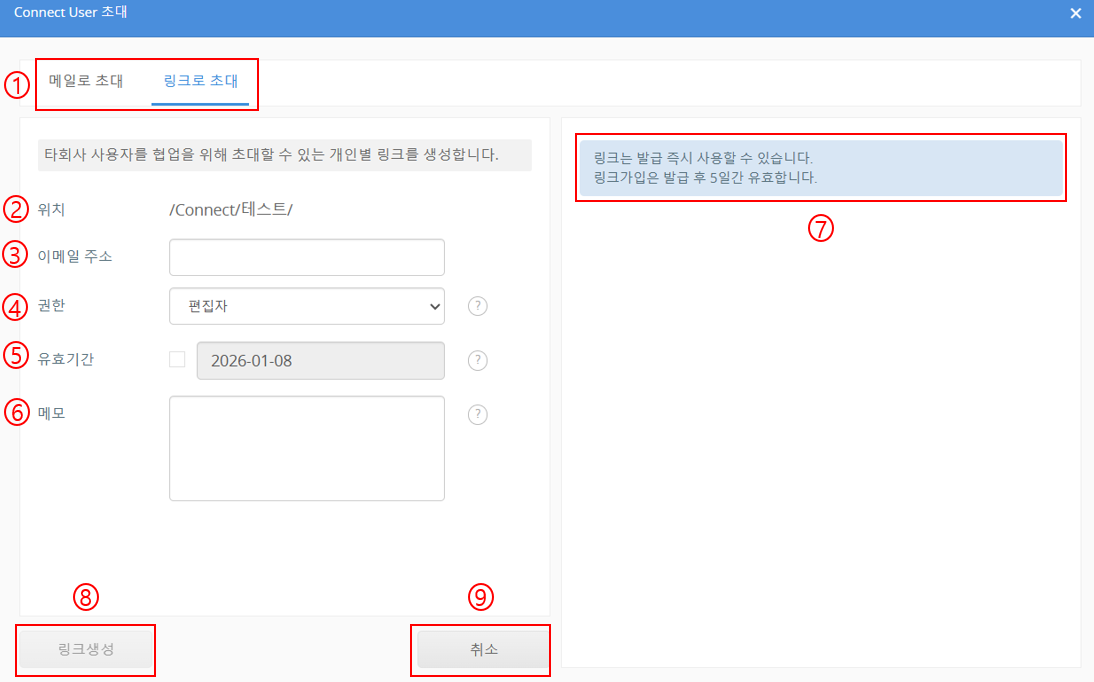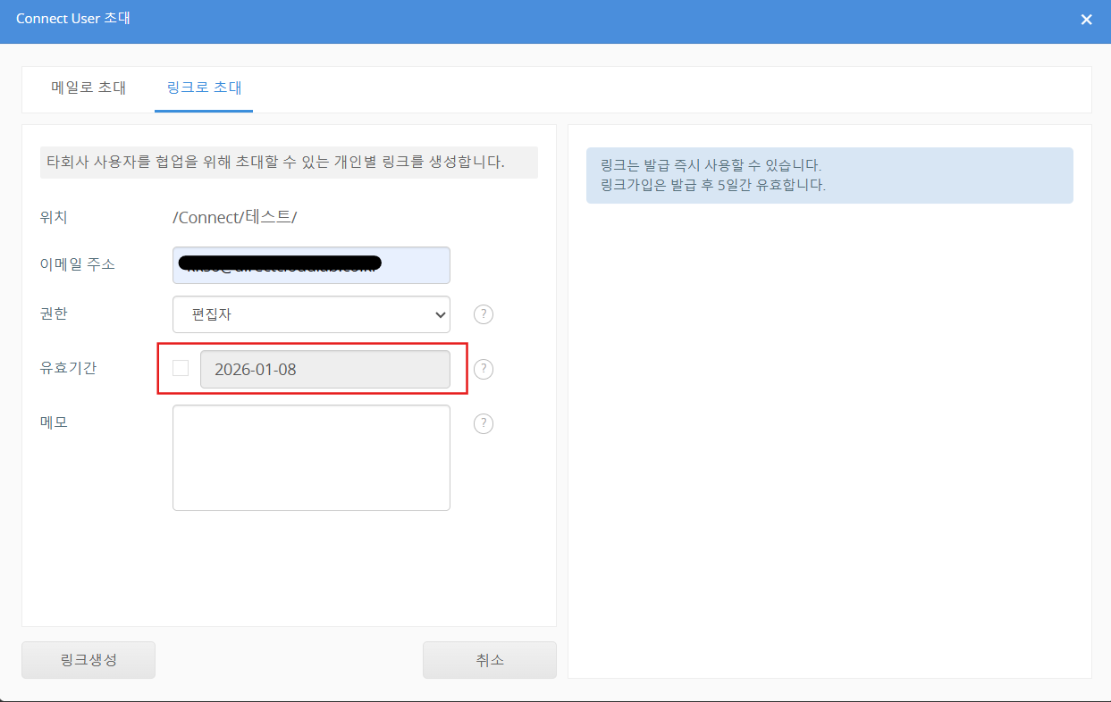 메일로 Connect User를 초대하는 경우든, 링크로 초대하는 경우든 Connect User 초대 URL의 유효 기간은 Connect 등록용 URL의 유효 기간을 변경하는 방법에서 설정된 기간이 적용됩니다.