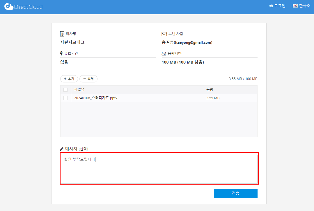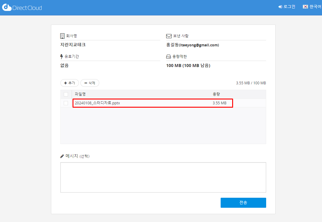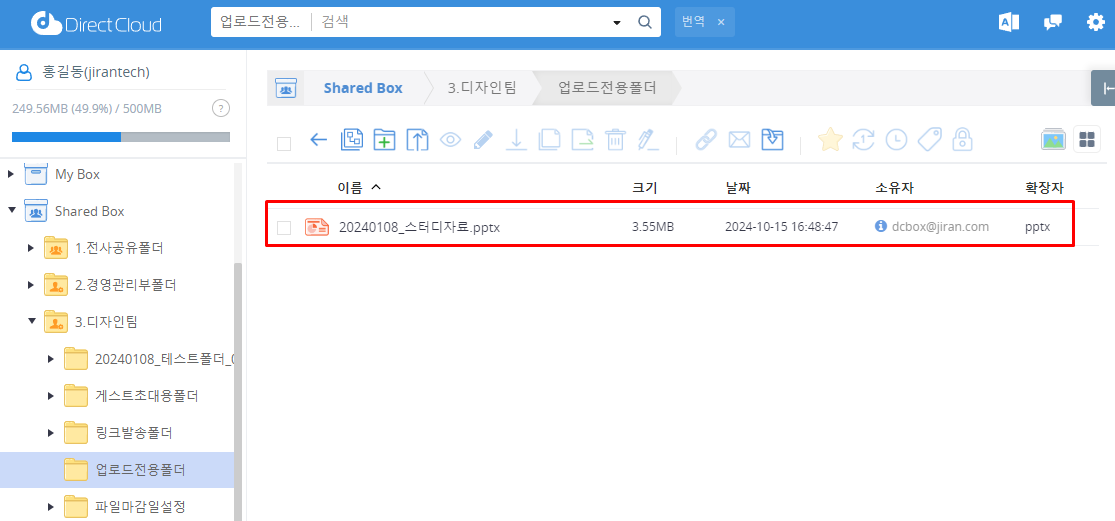 DirectCloud 계정이 있는 사용자는 DirectCloud에 로그인하여 수신할 폴더를 표시하여 업로드된 파일을 확인할 수 있습니다. 파일을 업로드한 사용자 입력란에 이메일 주소가 표시됩니다.