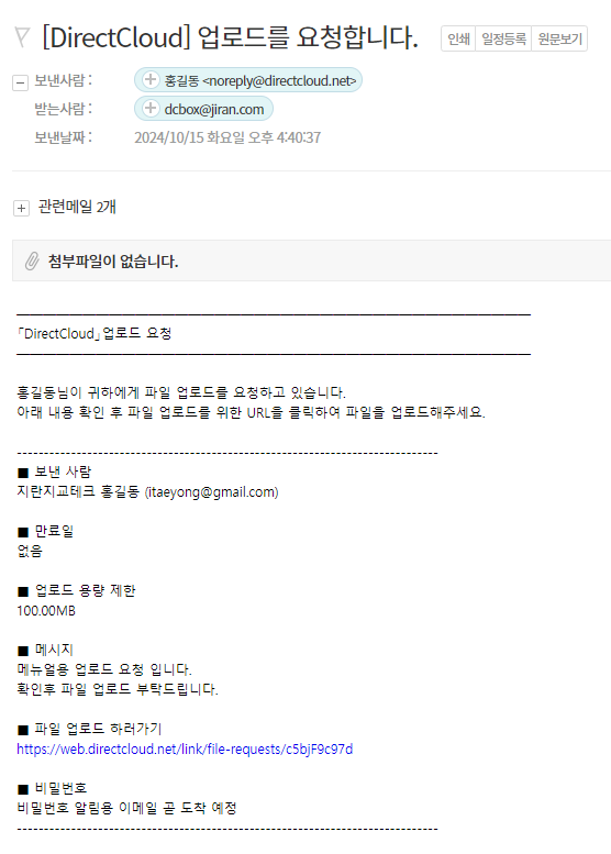"[DirectCloud] 업로드를 요청합니다."라는 제목의 이메일의 내용 중 '파일 업로드 하러가기'의 링크를 클릭합니다.