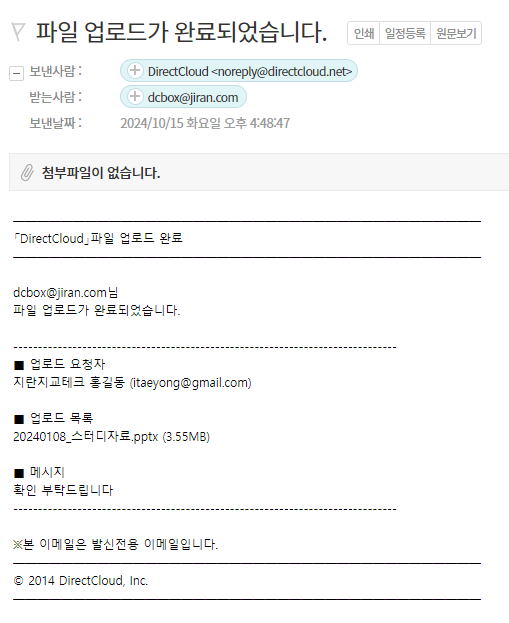업로드 요청 폴더에 파일을 업로드하면 파일을 업로드한 사용자와 수신 폴더에 업로드하도록 요청한 사용자 모두에게 알림 메일이 전송됩니다.