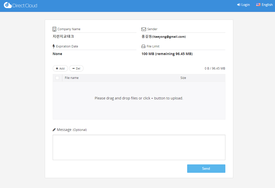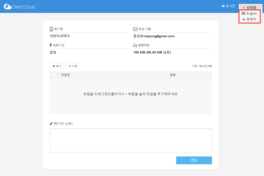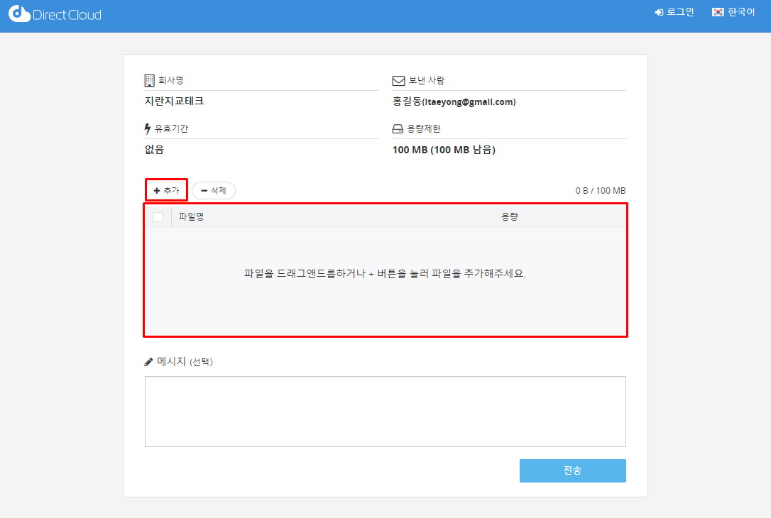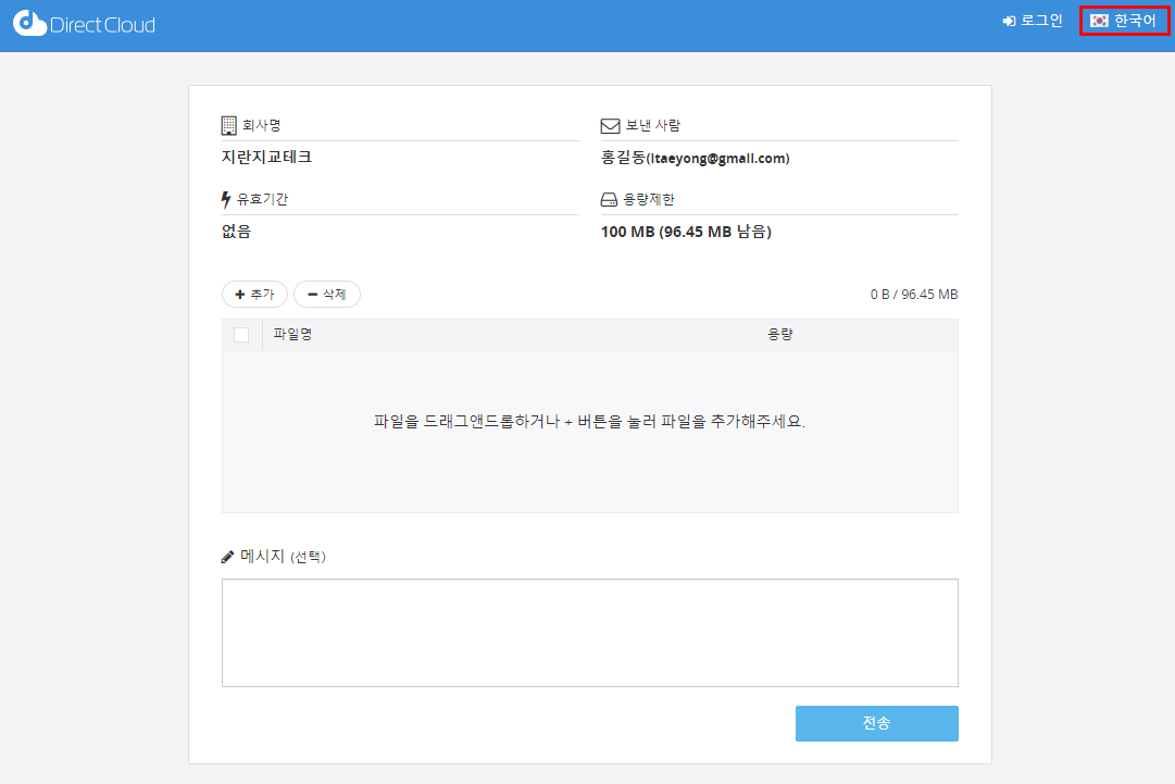 DirectCloud의 사용자 계정이 없어도 업로드 요청을 통해 파일을 업로드할 수 있습니다.