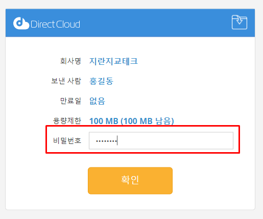 업로드 요청 URL에 비밀번호가 설정되어 있는 경우, 비밀번호 입력 화면이 표시됩니다. 비밀번호 입력 화면이 표시되지 않는 경우에는 3단계로 진행하세요.