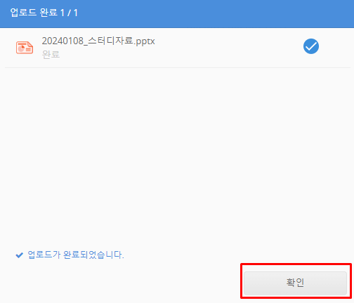 '업로드가 완료되었습니다.'라는 메시지가 표시되는지 확인하고 '확인' 버튼을 클릭합니다. 파일이 업로드됩니다.