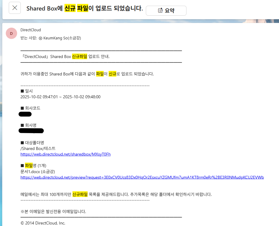 폴더에 파일을 업로드한 사용자에게 전송되는 알림 메일
