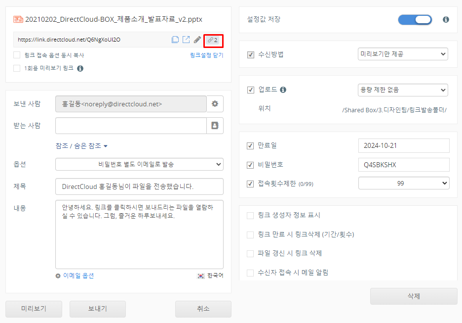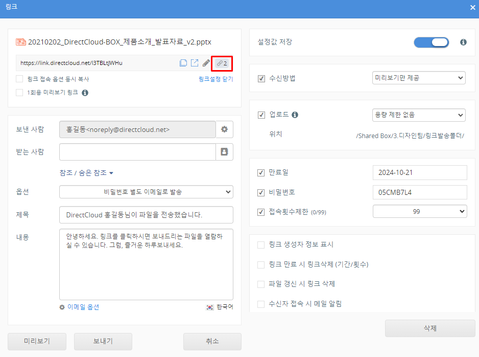 링크 수신 화면에서 파일을 미리보기 할 때 표시되는 날짜와 시간은 파일의 업데이트 시각입니다. 이 날짜와 시간은 숨길 수 없습니다. 동일한 파일명으로 파일을 덮어쓰면, 링크 수신 화면에서도 해당 파일의 업데이트 시각이 변경됩니다.