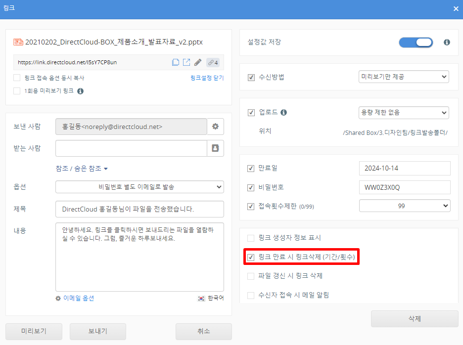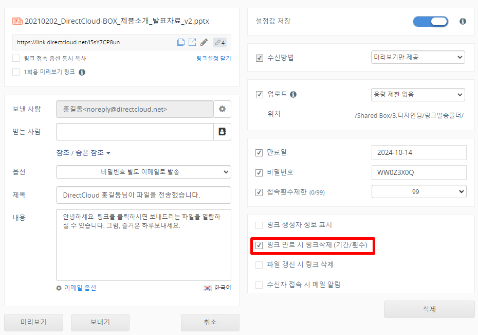 '링크 만료 시 링크삭제(기간/횟수)'를 선택합니다.