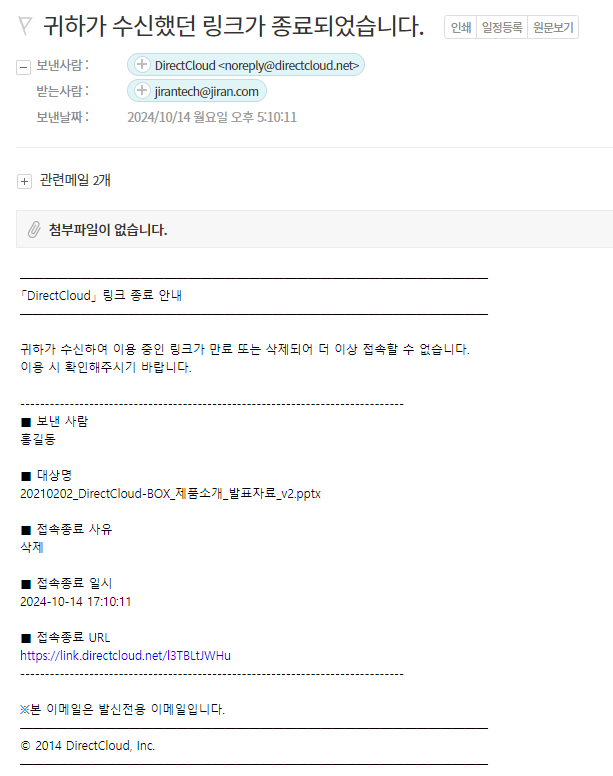 링크가 사용 중지되거나 삭제된 경우 보낸 사람과 받는 사람에게 다음과 같은 "귀하가 수신했던 링크가 종료되었습니다."라는 알림 메일이 전송됩니다.