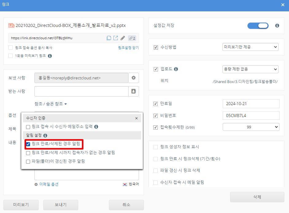 이 매뉴얼에서는 전송된 링크가 만료되거나 삭제된 경우, 발신자와 수신자에게 알림 메일이 전송되도록 설정하는 방법에 대해 설명합니다.