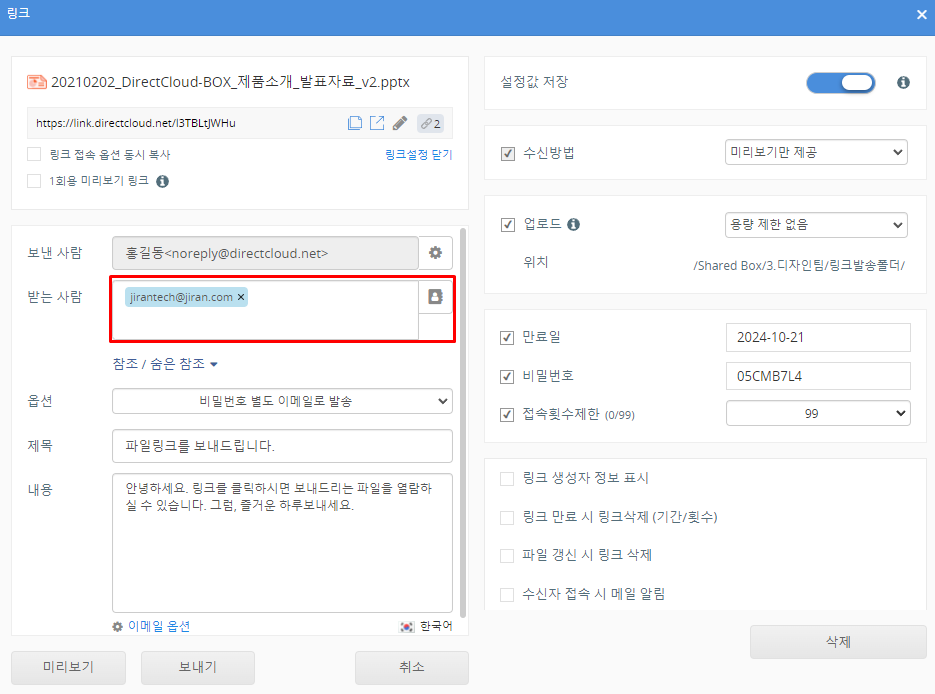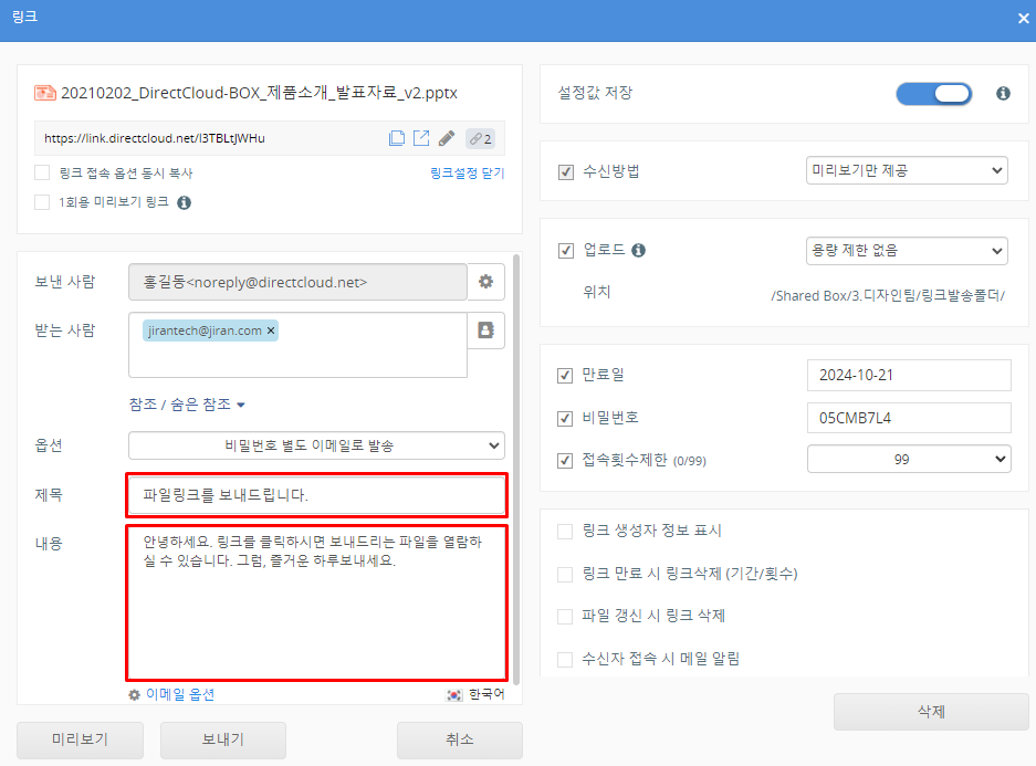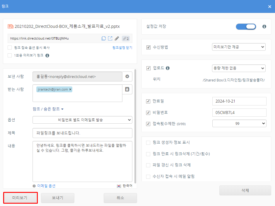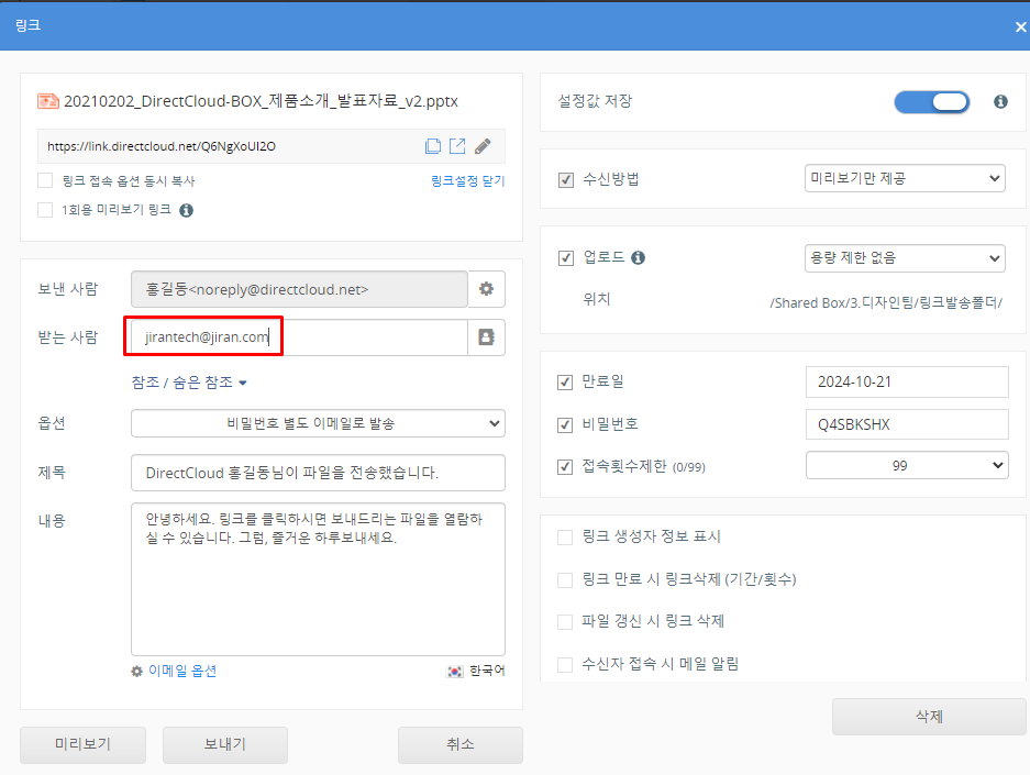 DirectCloud 드라이브에서 공유 링크 생성 및 전송