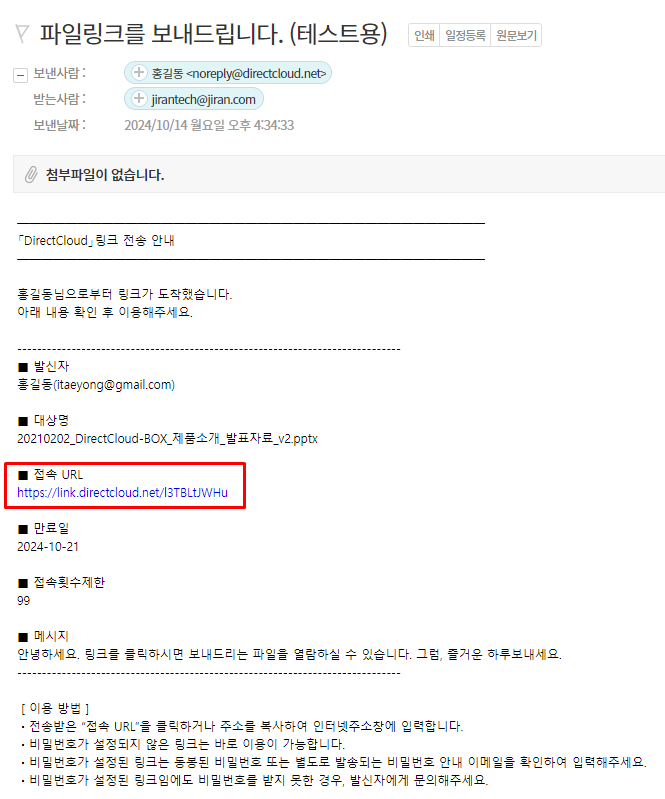 '링크 생성' 화면에서 만든 링크를 보내면 다음과 같은 이메일이 수신인에게 전송됩니다.