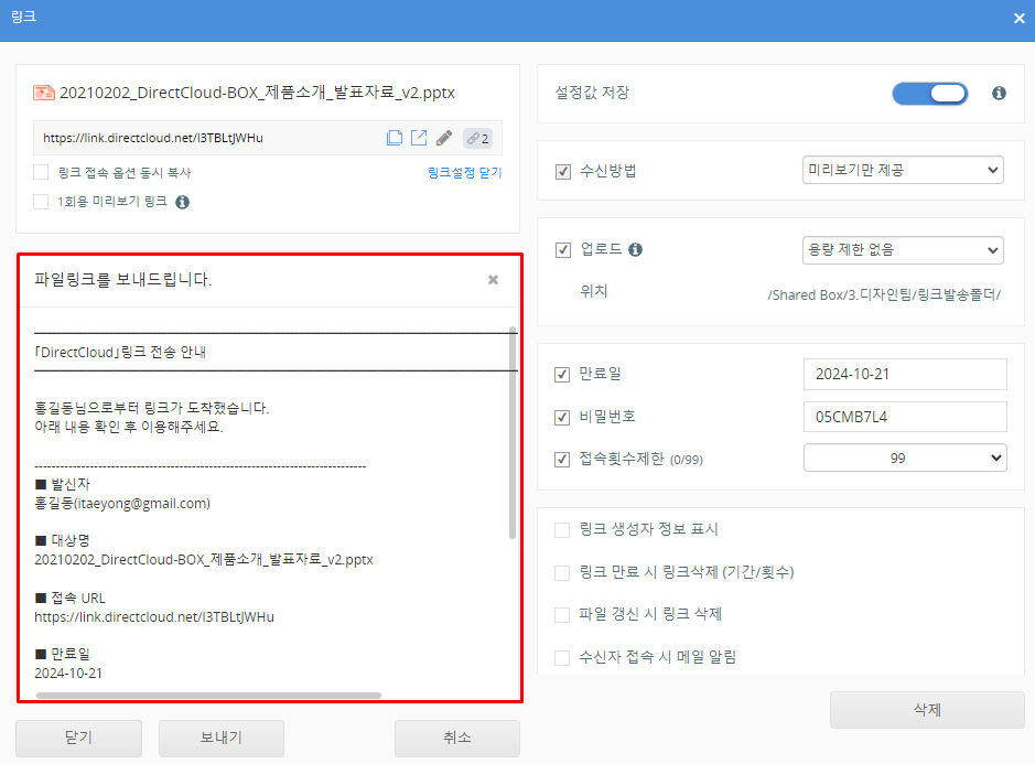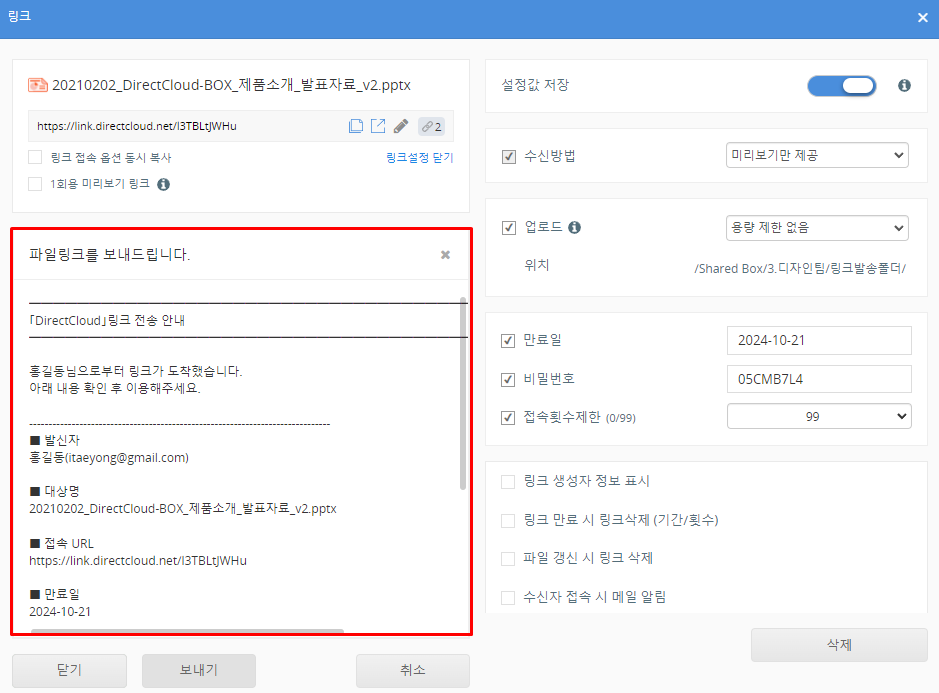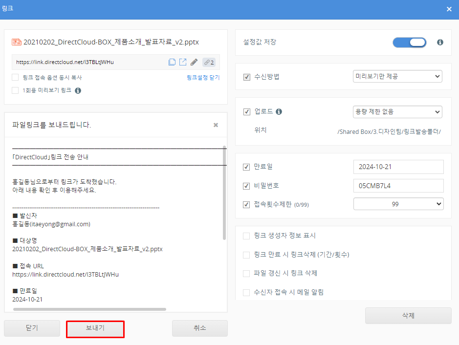 설정한 내용으로 링크를 보낼 수 있는 경우에는 '보내기' 버튼을 클릭합니다.