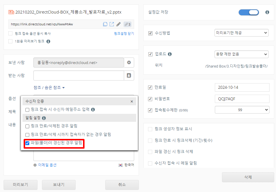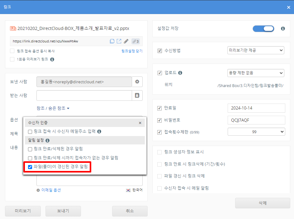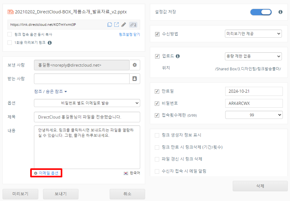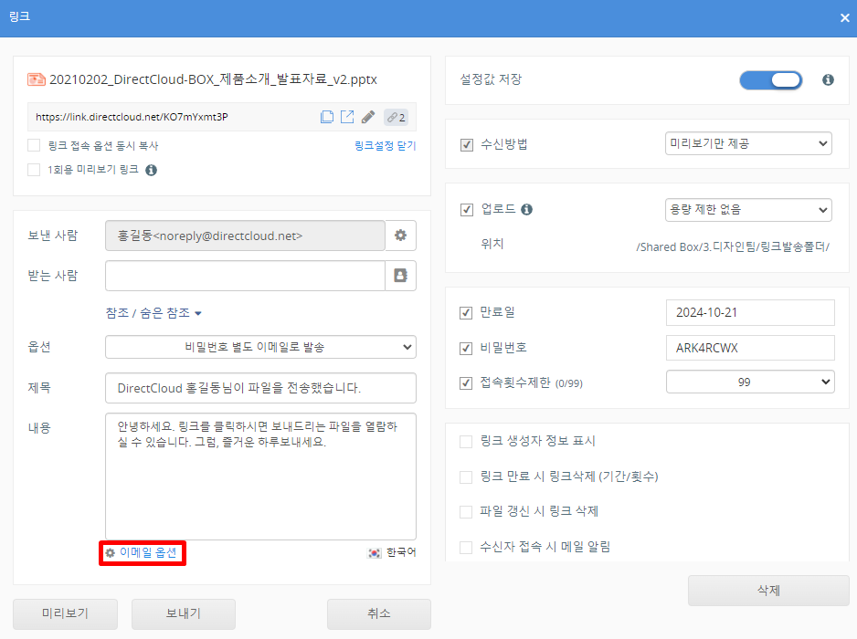 이메일 옵션 설정은 생성된 링크를 메일로 전송하는 경우에만 유효합니다. 생성된 링크를 복사하여 사용하는 경우, 예를 들어 SNS 등에 붙여넣어 공유하는 경우에는 적용되지 않습니다.