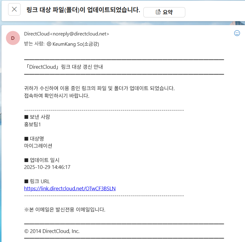링크 대상 폴더나 파일이 수정되면, 링크를 보낸 사람과 받은 사람에게 “링크 대상 파일(폴더)이 업데이트되었습니다.”라는 알림 메일이 발송됩니다.